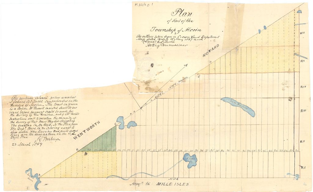 Sur ce plan d'une partie du canton Morin figurent le lac Bouchette, le lac Armstong ou Clear, le cadastre abrégé et une légende