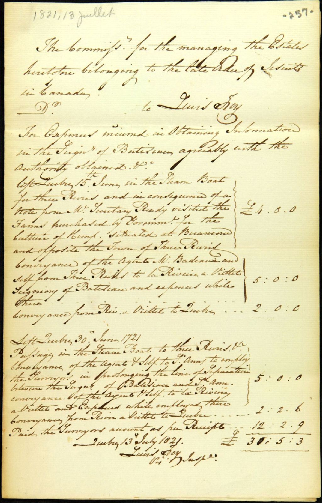 Compte de dépense de Lewis Foy, inspecteur visiteur des biens des Jésuites, de Québec, pour visite et arpentage dans la seigneurie de Batiscan, 13 juillet 1821, Archives nationales à Québec, Fonds Ministère des Terres et Forêts, (03Q,E21,S64,SS5,SSS10,D257).