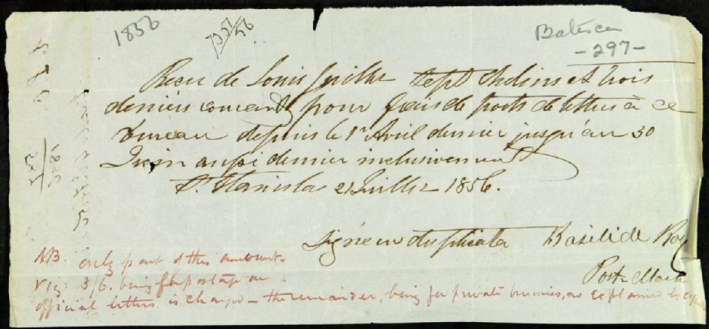 Reçu de Basilide (?) Roy, maître de poste, à Louis Guillet, junior, agent des biens des Jésuites pour la seigneurie de Batiscan, pour frais de port de lettres, 21 juillet 1856, Archives nationales à Québec, Fonds Ministère des Terres et Forêts, (03Q,E21,S64,SS5,SSS10,D297).