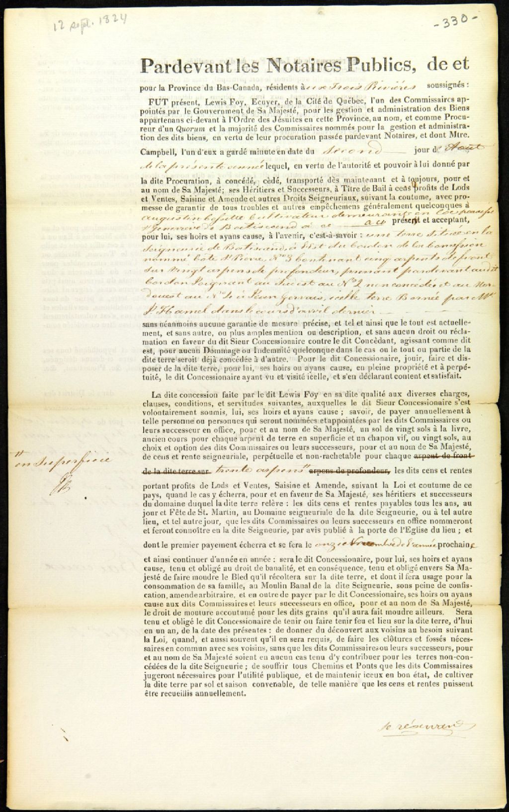 Concession d'une terre située en la seigneurie de Batiscan à l'est du cordon de la concession nommée côte Saint-Pierre no 3 ; par Lewis Foy, commissaire des biens des Jésuites, de la ville de Québec, à Augustin Cossette, cultivateur de la paroisse Sainte-Geneviève-de-Batiscan, 12 septembre 1824, Archives nationales à Québec, Fonds Ministère des Terres et Forêts, (03Q,E21,S64,SS5,SSS10,D330).