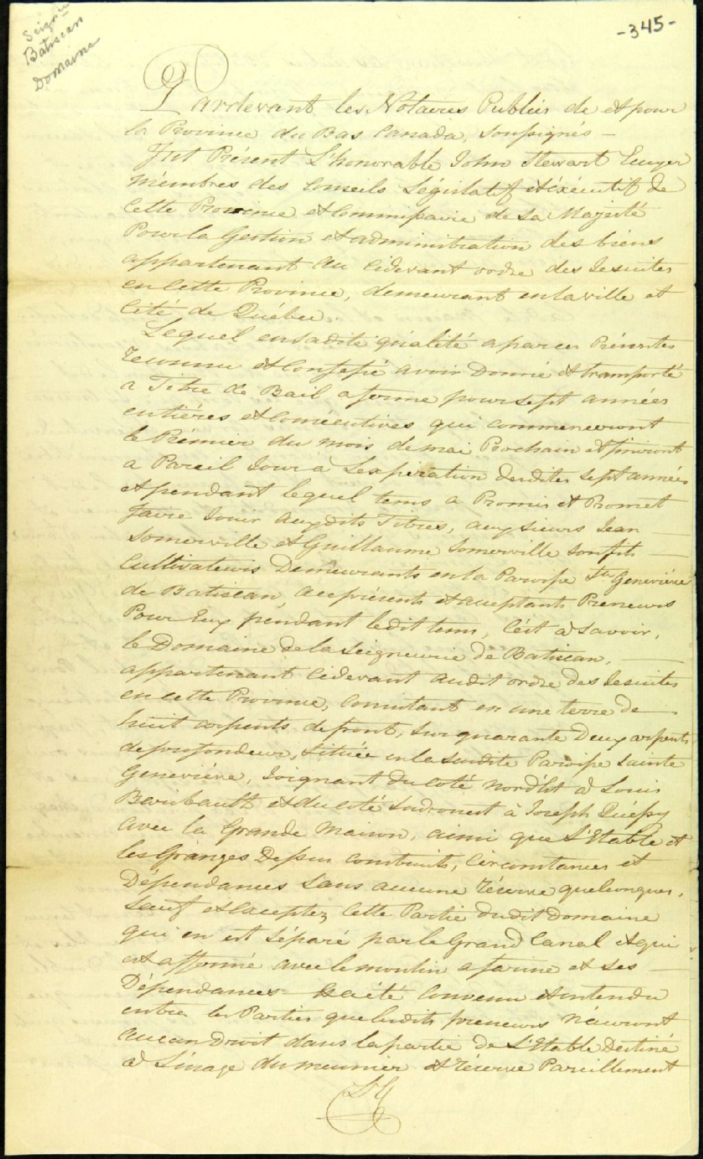 Bail à ferme (7 ans) du domaine de la seigneurie de Batiscan situé en la paroisse Sainte-Geneviève ; par John Stewart, membre des conseils législatif et exécutif de cette province et commissaire des biens des Jésuites, de la ville de Québec, à Jean Somerville et Guillaume Somerville, son fils, cultivateurs, de la paroisse Sainte-Geneviève-de-Batiscan, 7 avril 1834, Archives nationales à Québec, Fonds Ministère des Terres et Forêts, (03Q,E21,S64,SS5,SSS10,D345).