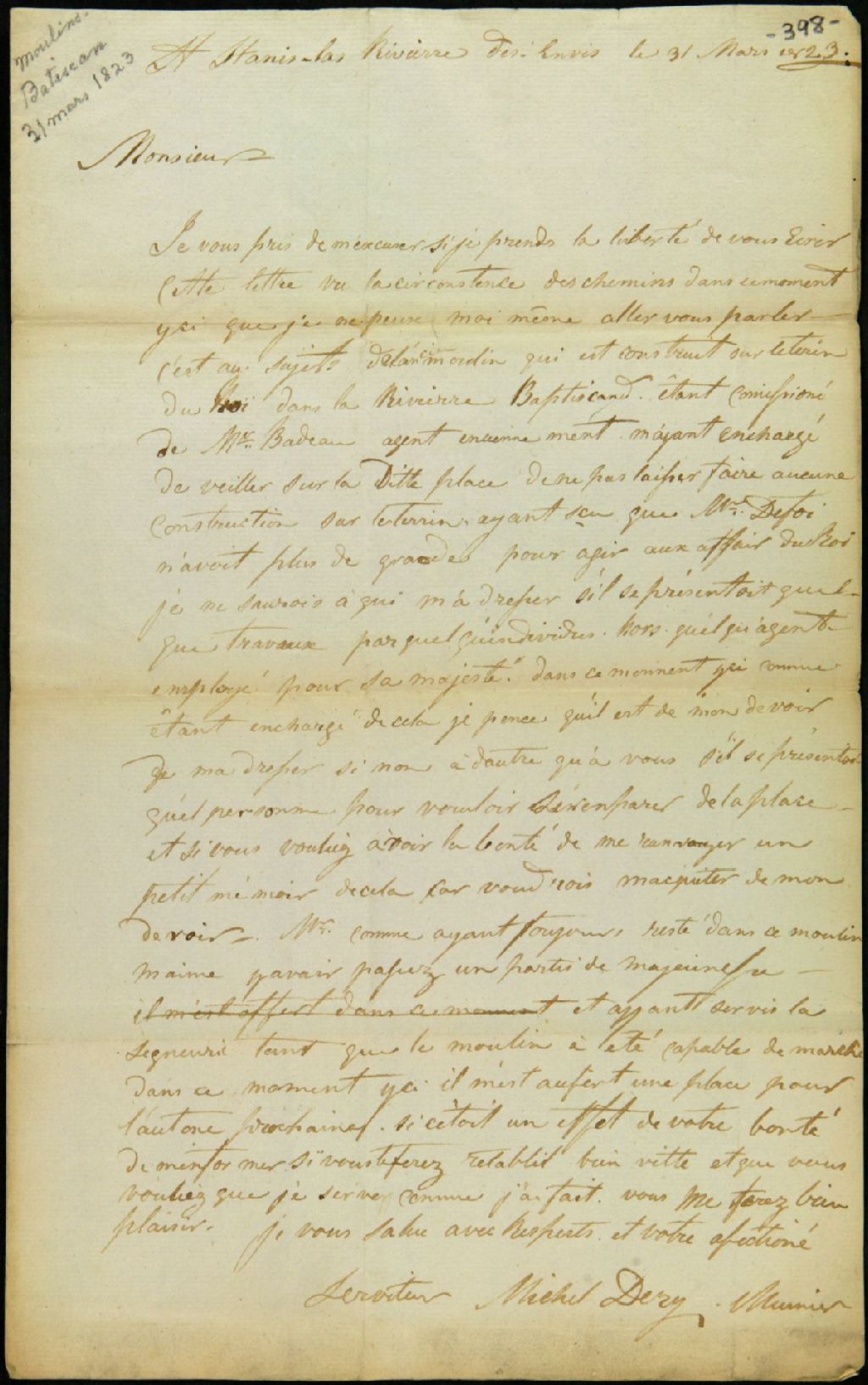 Lettre de Michel Déry, meunier, de Saint-Stanislas, rivière des Envies, à monsieur Bélaine (?), commissaire des biens des Jésuites, de la ville de Québec, au sujet de l'ancien moulin qui est construit sur le terrain du Roi dans la rivière Batiscan, 31 mars 1823, Archives nationales à Québec, Fonds Ministère des Terres et Forêts, (03Q,E21,S64,SS5,SSS10,D398).