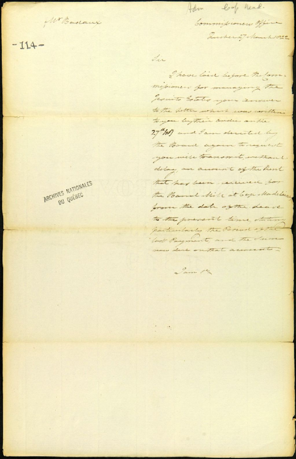 Lettre s.s. à Joseph Badeaux, concernant la perception d'un montant de rente qu'il a reçu pour le moulin du Cap-de-la-Madeleine, 27 mars 1822, Archives nationales à Québec, Fonds Ministère des Terres et Forêts, (03Q,E21,S64,SS5,SSS11,D114).