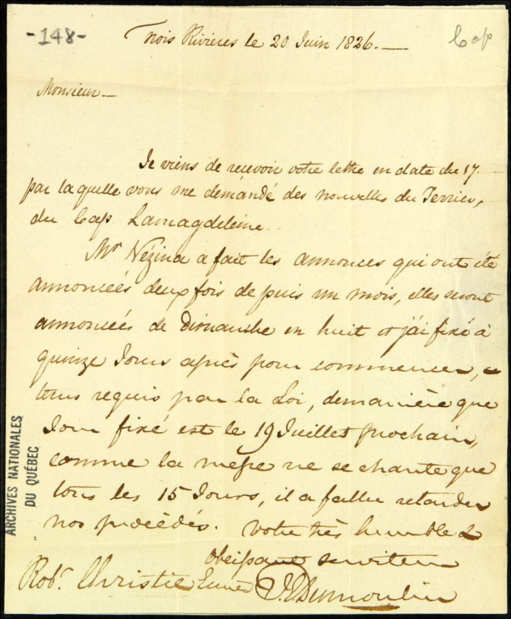 Lettre de Jean-Emmanuel Dumoulin à Robert Christie, écuyer, qu'il informe sur le terrier du Cap-de-la-Madeleine, 20 juin 1826, Archives nationales à Québec, Fonds Ministère des Terres et Forêts, (03Q,E21,S64,SS5,SSS11,D148).