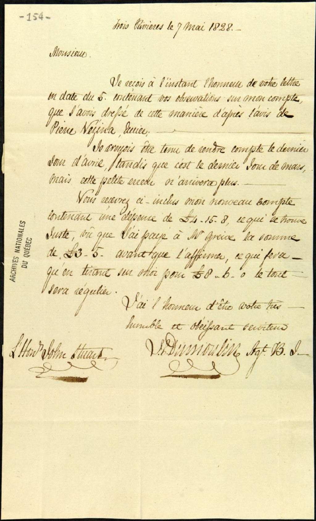 Lettre de Jean-Emmanuel Dumoulin, agent des biens des Jésuites, à John Stewart, écuyer, commissaire pour les biens des Jésuites, qui s'excuse d'avoir dressé le rapport en retard et qu'il envoie son nouveau compte, 7 mai 1828, Archives nationales à Québec, Fonds Ministère des Terres et Forêts, (03Q,E21,S64,SS5,SSS11,D154).