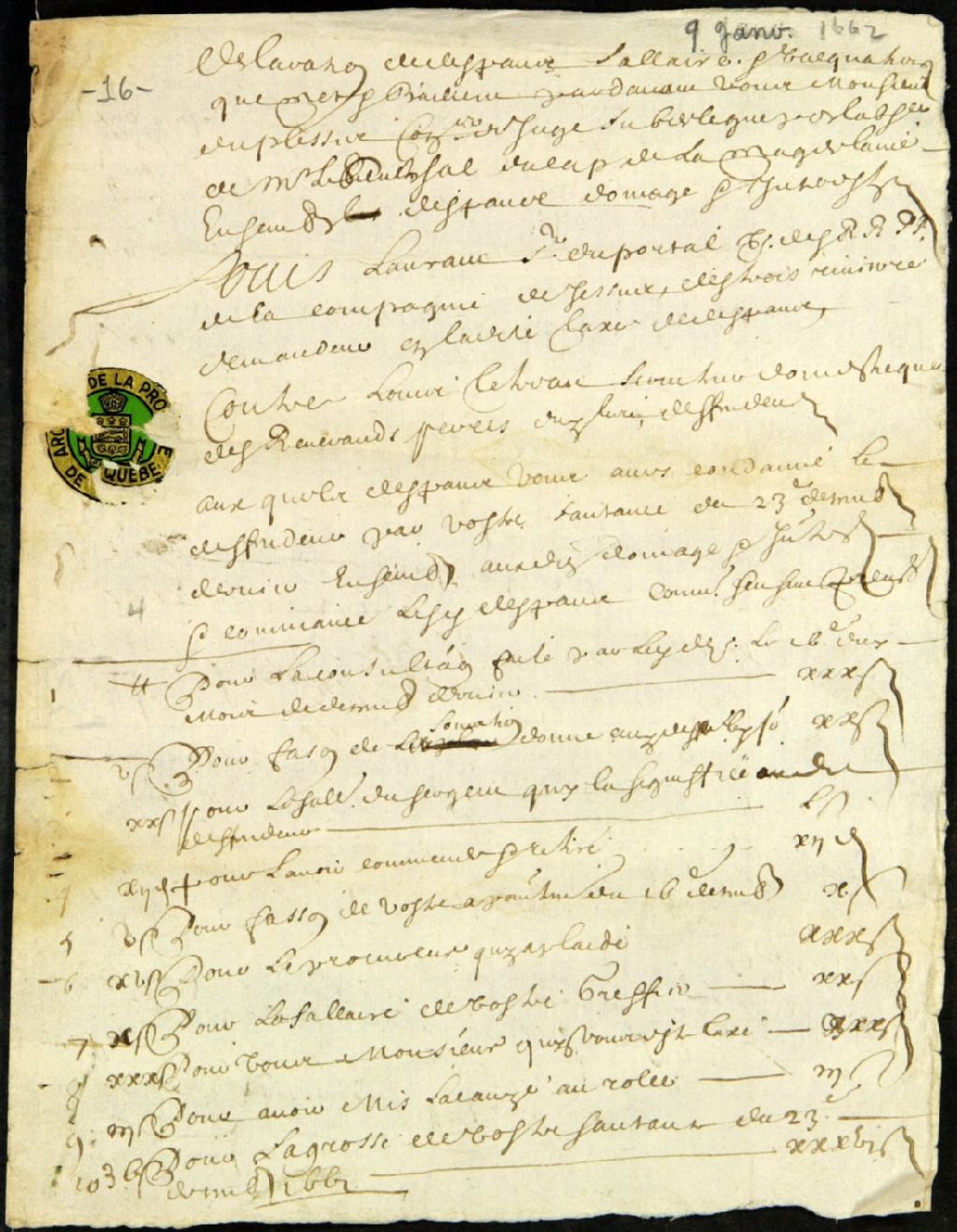 Déclaration par Louis Laurent, sieur du Portail, agissant pour les Jésuites, des dépens, dommages et intérêt que Louis Tétreau est condamné à payer, 9 janvier 1662, Archives nationales à Québec, Fonds Ministère des Terres et Forêts, (03Q,E21,S64,SS5,SSS11,D16).