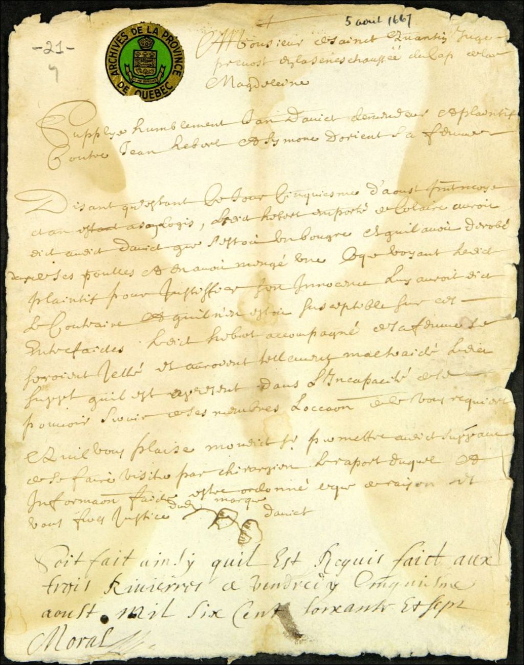 Requête présentée à Saint-Quentin, sieur de Saint-Quentin, juge prévôt de la Sénéchaussée du Cap-de-la-Madeleine, par Jean Daniel, concernant un vol de poules