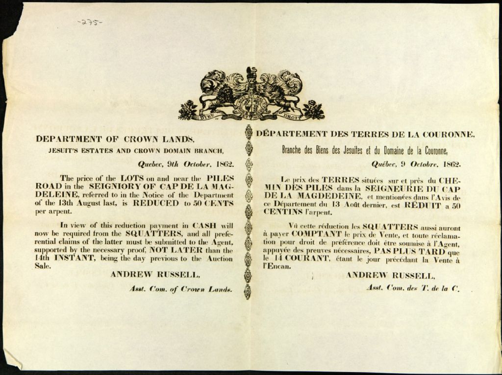 Avis public du département des Terres de la Couronne des lots situés sur le chemin des Piles dans la seigneurie du Cap-de-la-Madeleine, au sujet d'une réduction du prix de l'arpent de certaines terres, par Andrew Russel, commissaire des Terres de la Cour, 9 octobre 1862, Archives nationales à Québec, Fonds Ministère des Terres et Forêts, (03Q,E21,S64,SS5,SSS11,D275).