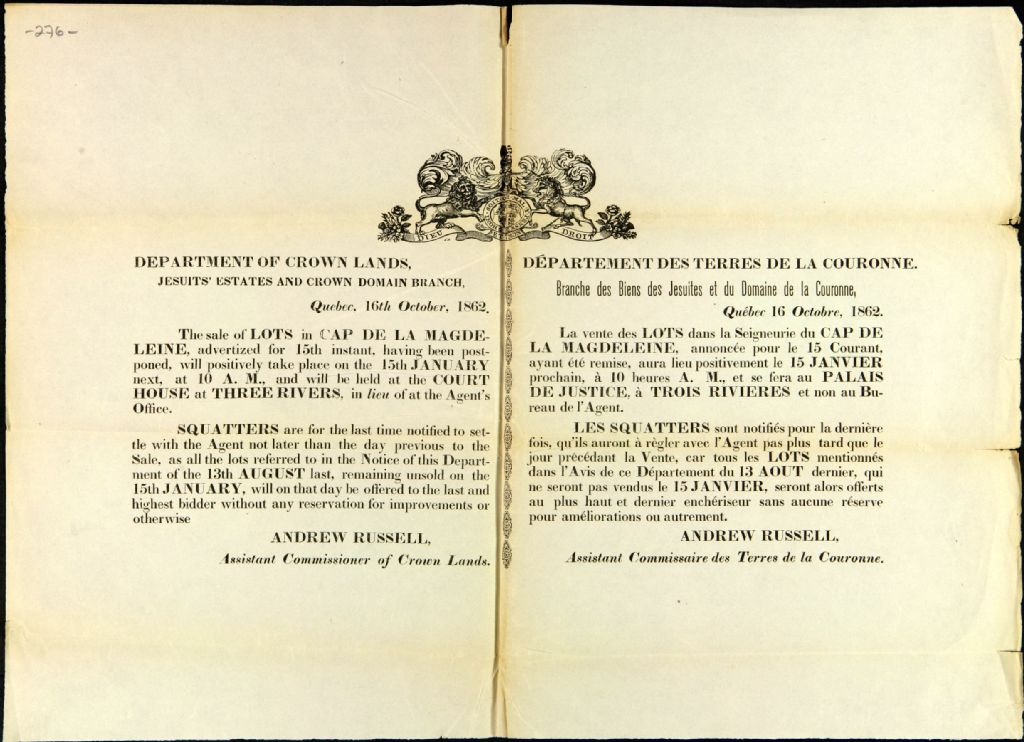Avis public du département des Terres de la Couronne des lots dans la seigneurie du Cap-de-la-Madeleine, au sujet du changement de date pour une vente de lots, par Andrew Russel, commissaire des Terres de la Cour, 16 octobre 1862, Archives nationales à Québec, Fonds Ministère des Terres et Forêts, (03Q,E21,S64,SS5,SSS11,D276).