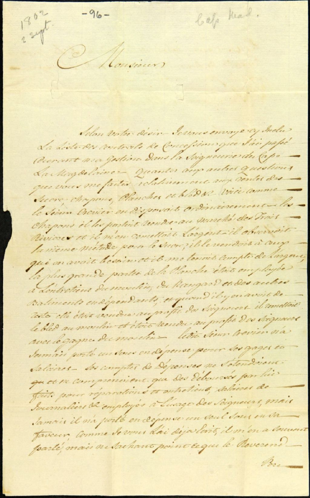 Lettre de François-Xavier Larue, sur des questions à lui posées sur sa gestion dans la seigneurie du Cap-de-la-Madeleine, 2 septembre 1802, Archives nationales à Québec, Fonds Ministère des Terres et Forêts, (03Q,E21,S64,SS5,SSS11,D96).