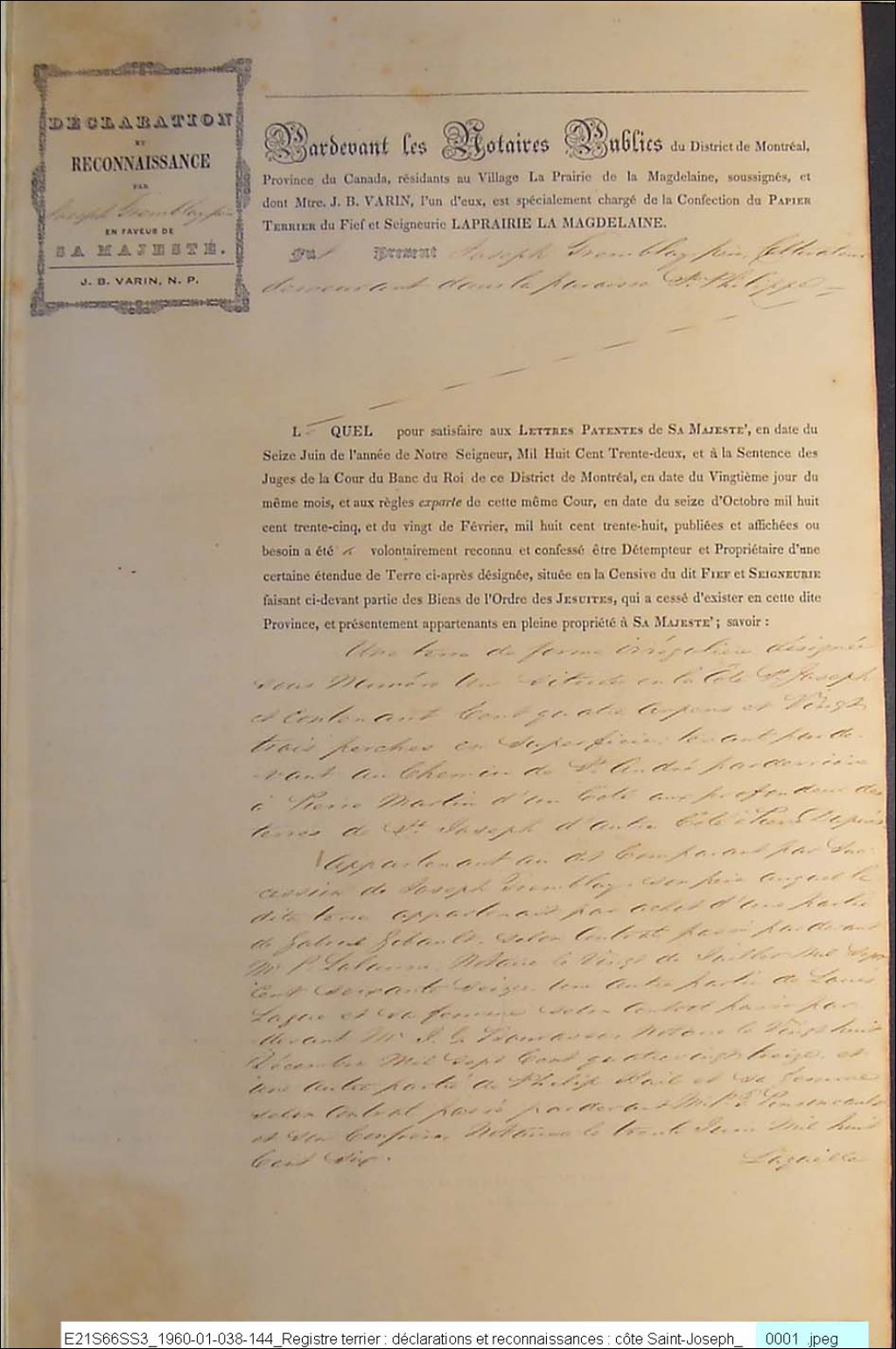Seigneurie de la Prairie-de-la-Madeleine - registre terrier contenant les déclarations et reconnaissances des fiefs Saint-Joseph, Grande-Coulée, Saint-François Xavier, Saint-Ignace et Sainte-Catherine, Vol. 6, 1840-1842, Archives nationales à Québec, Fonds Ministère des Terres et Forêts, (03Q,E21,S64,SS5,SSS15,D22).