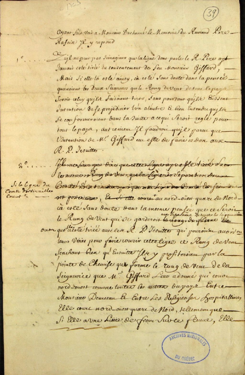 Réponse de monsieur Duchesnay, par monsieur d'Auteuil, au mémoire du Révérend Père Pierre Raffeix, dans le procès opposant ledit sieur Duchesnay aux Révérends Pères Jésuites, au sujet de la ligne qui sépare les seigneuries de Beauport et de Notre-Dame-des-Anges, 1er janvier 1679 - 29 août 1724, Archives nationales à Québec, Fonds Ministère des Terres et Forêts, (03Q,E21,S64,SS5,SSS1,D39).