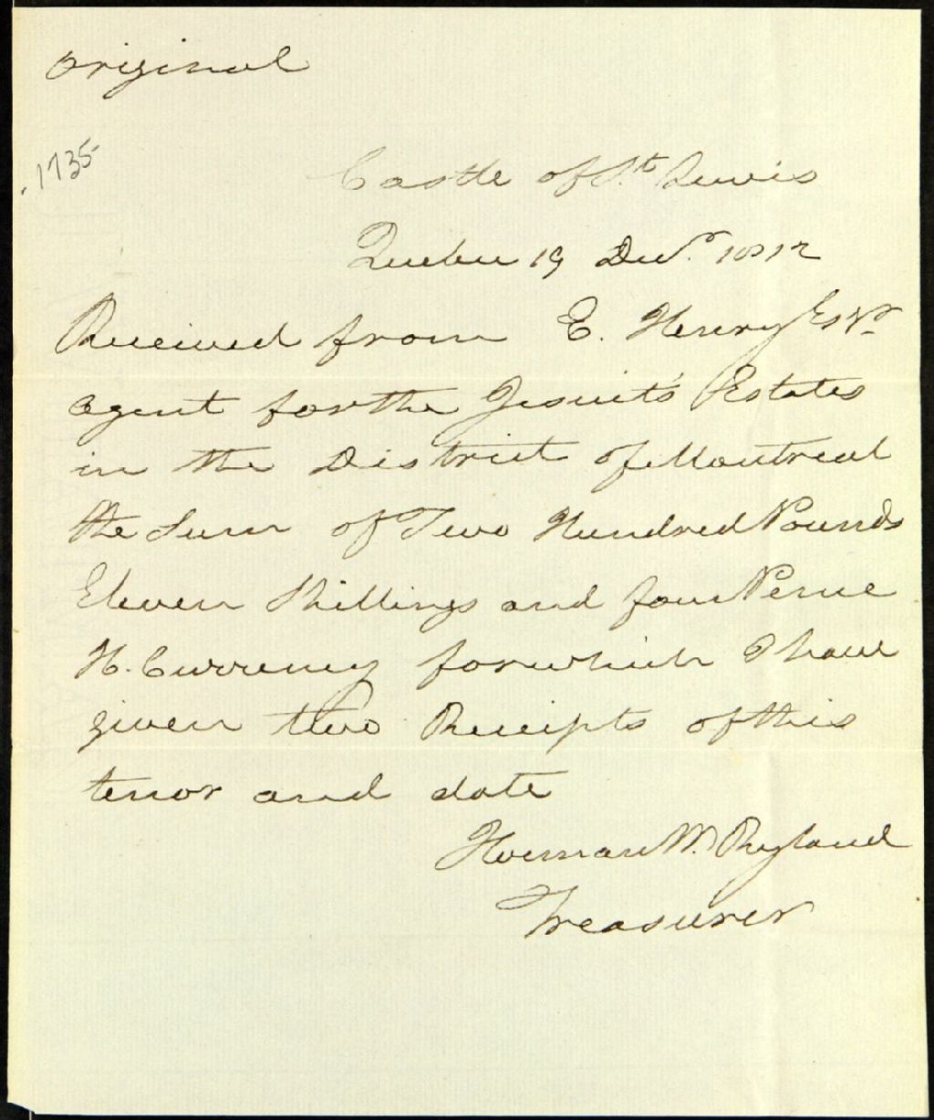 Lettre d'Herman W. [Witsius] Ryland, trésorier et [secrétaire civil du gouverneur], à George Pyke, secrétaire de la Commission responsable de l'administration des biens des Jésuites, laquelle lettre a été rédigée au Château Saint-Louis. Au sujet d'une somme qu'a payée E.[Edme] Henry, agent responsable des biens des Jésuites pour le District de Montréal, et pour laquelle Ryland a fourni deux reçus, 19 décembre 1812, Archives nationales à Québec, Fonds Ministère des Terres et Forêts, (03Q,E21,S64,SS5,SSS2,D1735).
