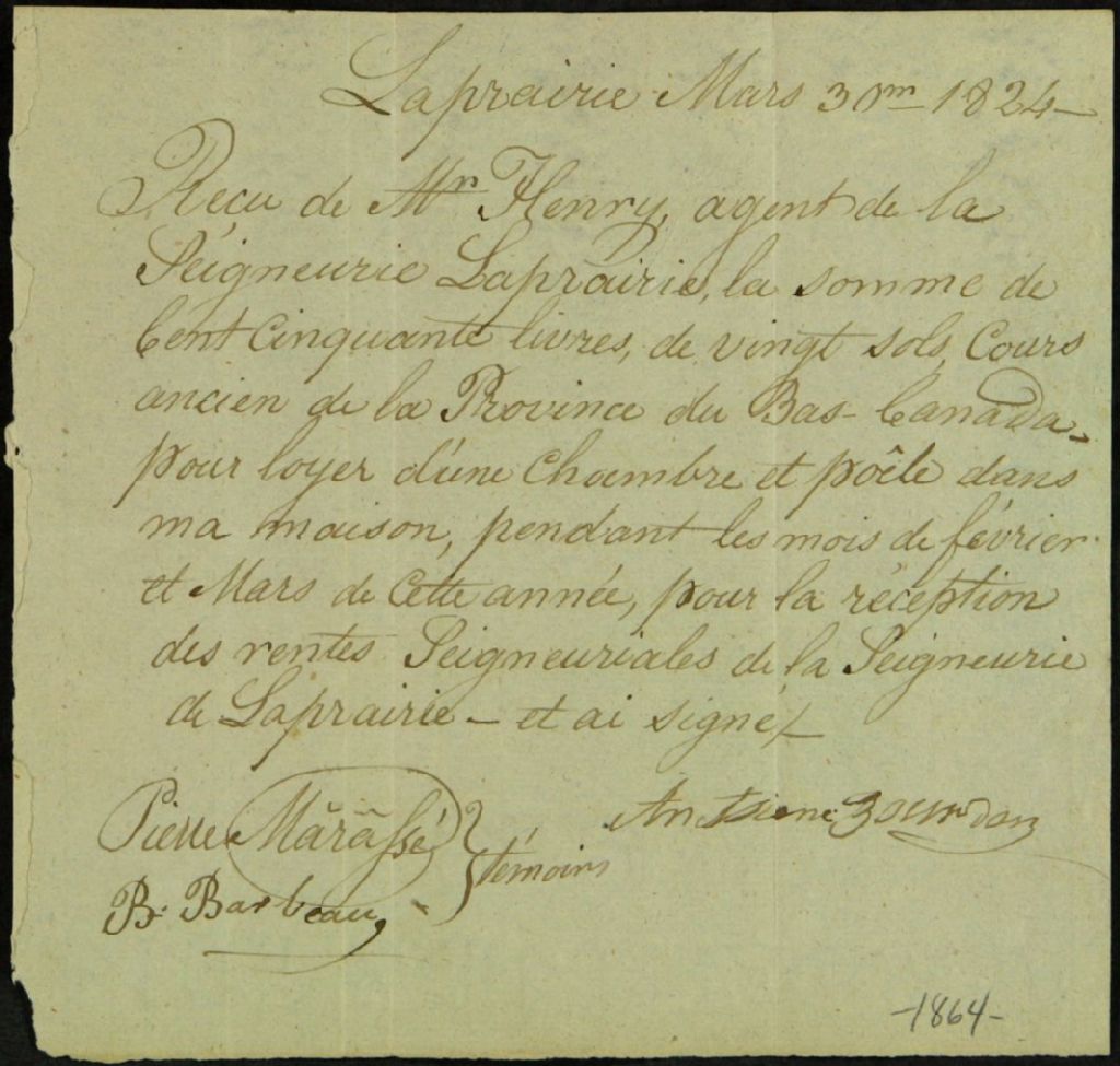 Reçu attestant le paiement d'une somme de 150 livres et 20 sols, cours ancien de la province du Bas-Canada, à Antoine Bourdon par [Edme] Henry, agent de la seigneurie de Laprairie, pour le loyer d'une chambre et d'un poêle dans sa maison, et ce, pour la réception des rentes seigneuriales de la seigneurie de Laprairie, 30 mars 1824, Archives nationales à Québec, Fonds Ministère des Terres et Forêts, (03Q,E21,S64,SS5,SSS2,D1864).
