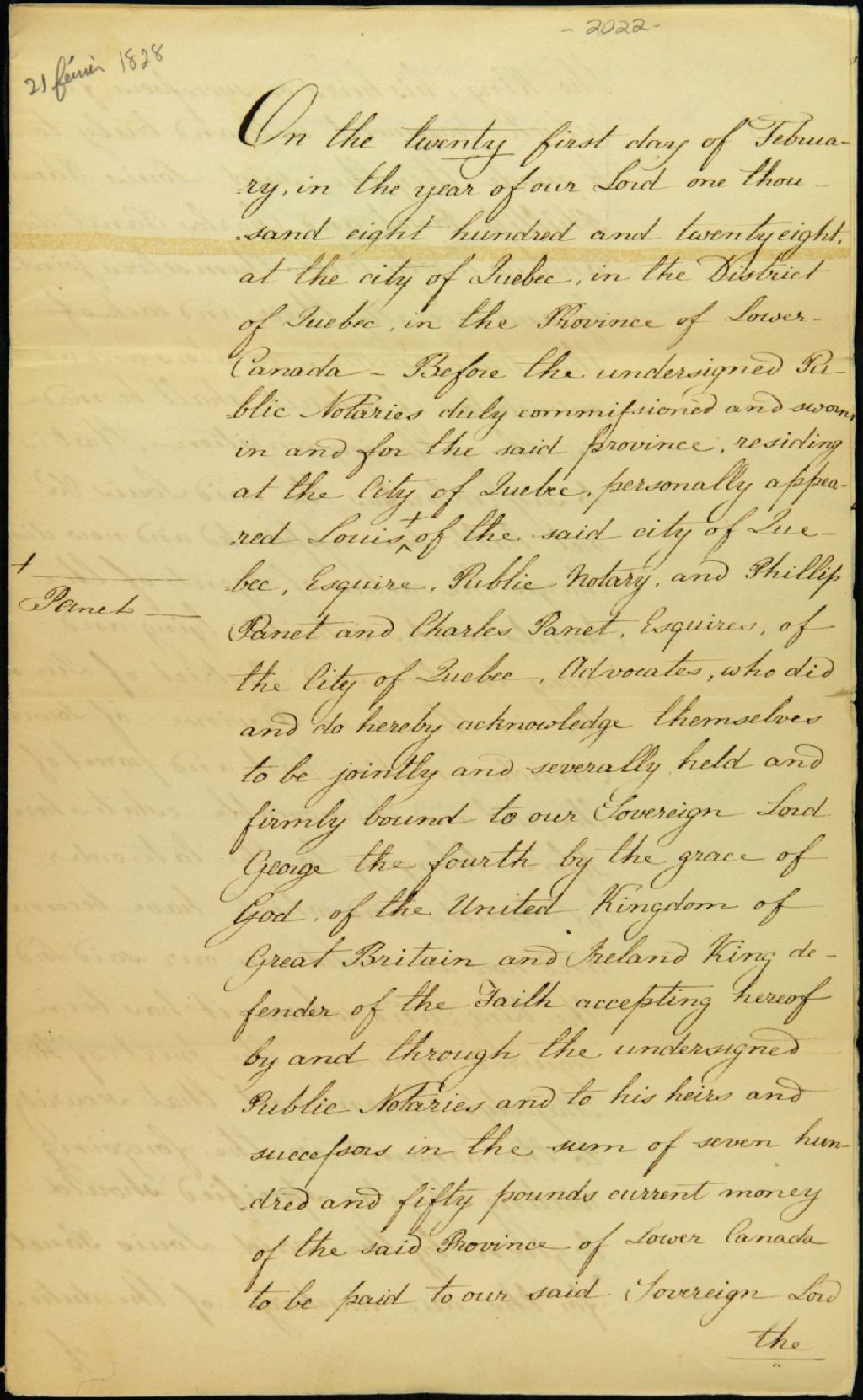 - Obligation de Louis Panet, notaire public de la ville de Québec, et Philippe Panet et Charles Panet, avocats de la ville de Québec, à titre de cautionnement audit Louis Panet, pour remplir sa charge d'agent des biens des Jésuites pour le District de Québec