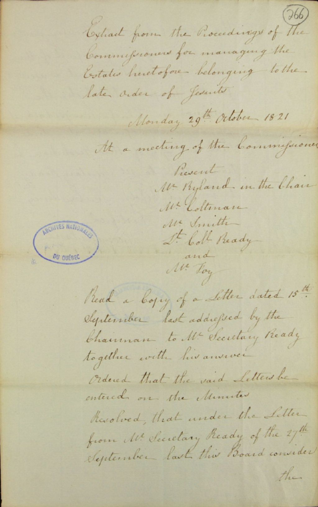 Extrait d'un procès-verbal d'une réunion de la commission responsable de l'administration des biens des Jésuites, au sujet de la demande du comité des deux églises [protestantes] pour obtenir une portion de LaVacherie (La Vacherie) pour y établir un cimetière