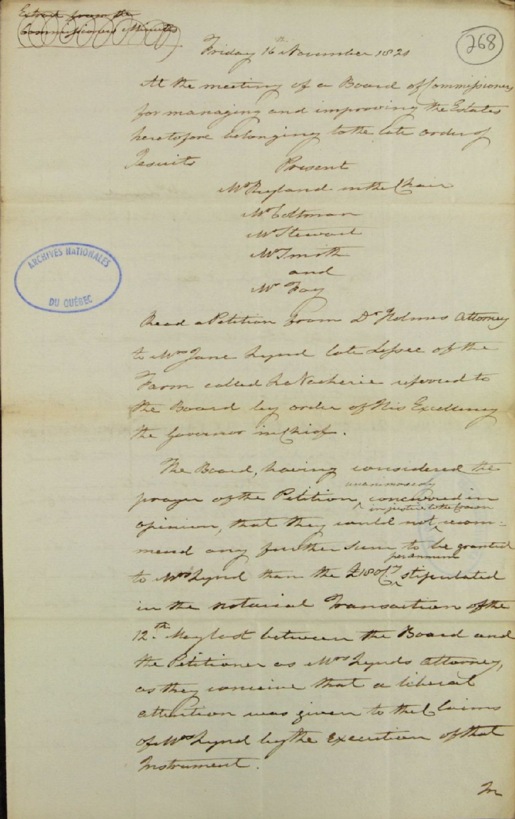 Brouillon d'un procès-verbal d'une réunion de la commission responsable de l'administration des biens des Jésuites, au sujet d'une requête du docteur [William] Holmes, mandataire de Mme Jane Lynd (Jane Henry), veuve de David Lynd et ancienne locataire de La Vacherie (DBC), 16 novembre 1821, Archives nationales à Québec, Fonds Ministère des Terres et Forêts, (03Q,E21,S64,SS5,SSS2,D268).