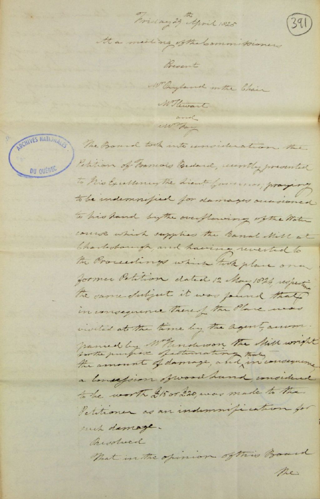 Brouillon d'un procès-verbal d'une réunion de la commission responsable de l'administration des biens des Jésuites, au sujet d'une requête de François Bédard, réclamant une indemnisation pour sa terre endommagée par une inondation du cours d'eau (canal) alimentant le moulin banal de Charlesbourg; au sujet d'une lettre de [Lewis] Foy, en tant que procurateur pour la confection d'un papier-terrier pour la seigneurie de Batiscan, adressée à [Joseph] Badeaux et non répondue par lui; au sujet de l'autorisation accordée à L. Foy d'employer [Louis] Guillet, notaire public, pour inclure la déclaration de papier-terrier à être faite par les censitaires, 29 avril 1825, Archives nationales à Québec, Fonds Ministère des Terres et Forêts, (03Q,E21,S64,SS5,SSS2,D391).