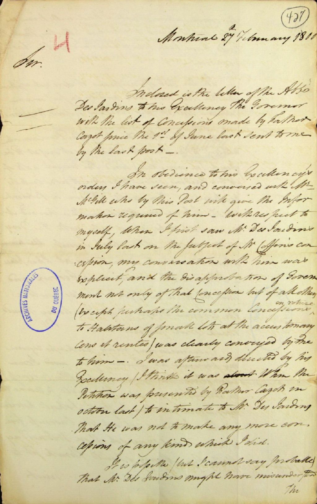 - Lettre de Jonathan Sewell, procureur général du Bas-Canada, à Herman Witsius Ryland, secrétaire civil du lieutenant-gouverneur, au sujet du recensement fait par l'abbé [Philippe-Jean-Louis] Desjardins