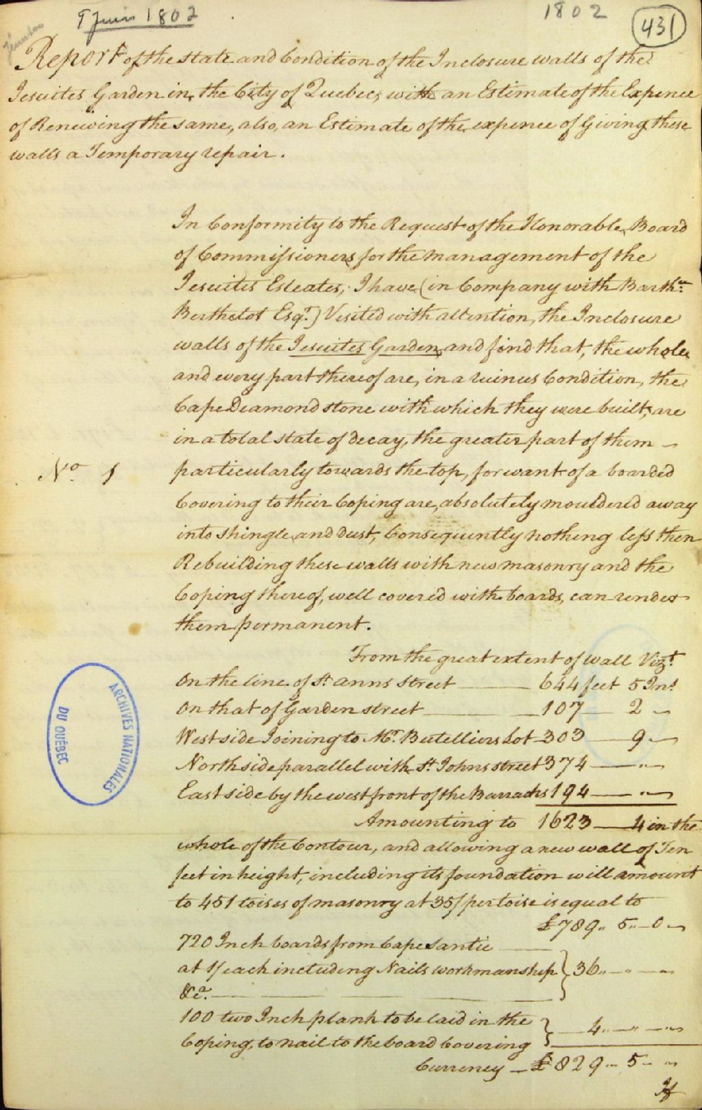 - Rapport détaillé sur l'état de délabrement de la partie du mur du jardin des Jésuites donnant sur la rue des Jardins et la longueur de chaque partie du mur. J. Thompson y propose, pour réduire les frais, de diminuer la hauteur de la partie à réparer