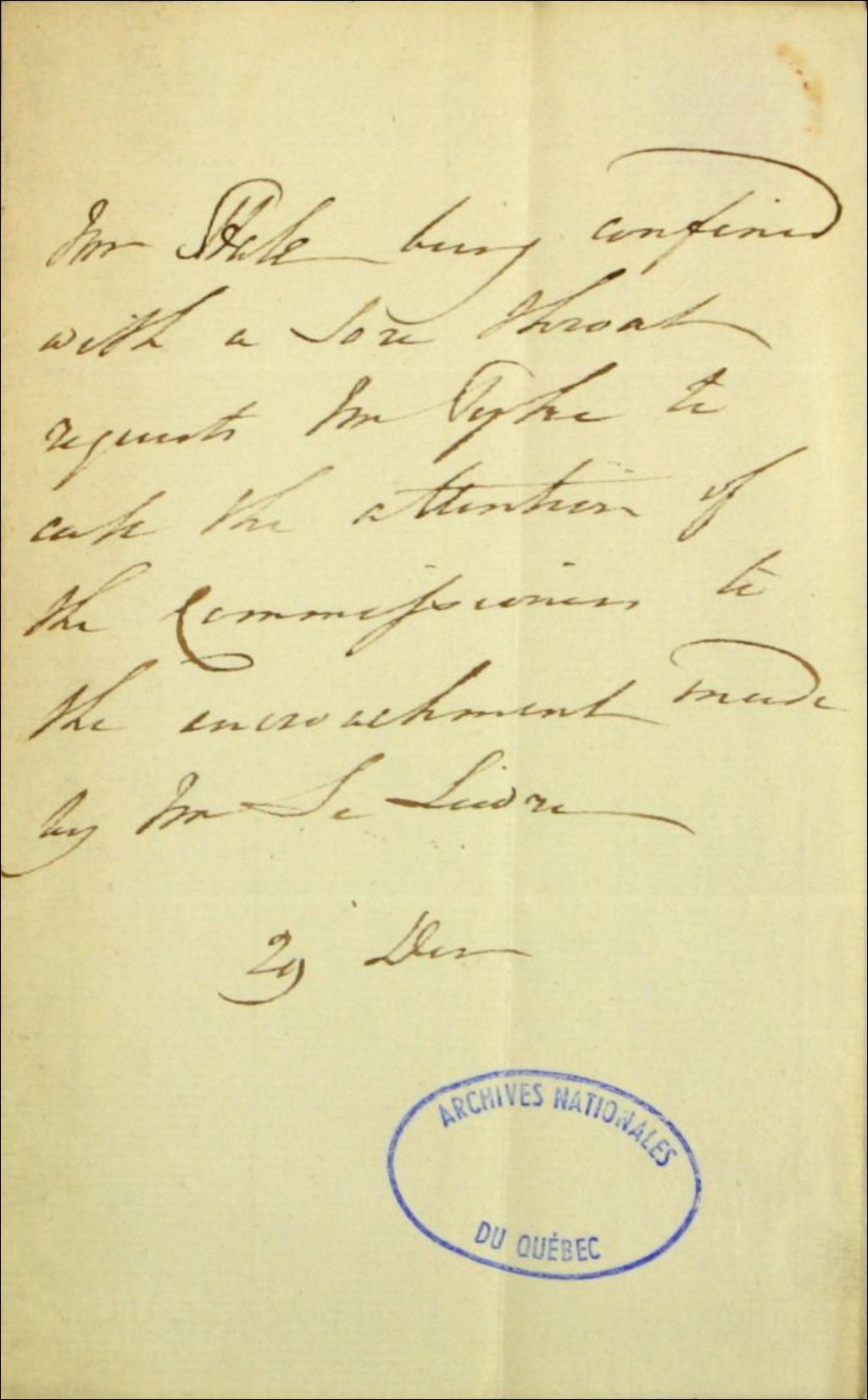 Lettre de John Hale demandant à George Pyke, secrétaire de la commission responsable de l'administration des biens des Jésuites, d'attirer l'attention des commissaires sur l'empiétement fait par un certain Lelièvre., 29 décembre 1810, Archives nationales à Québec, Fonds Ministère des Terres et Forêts, (03Q,E21,S64,SS5,SSS2,D446).