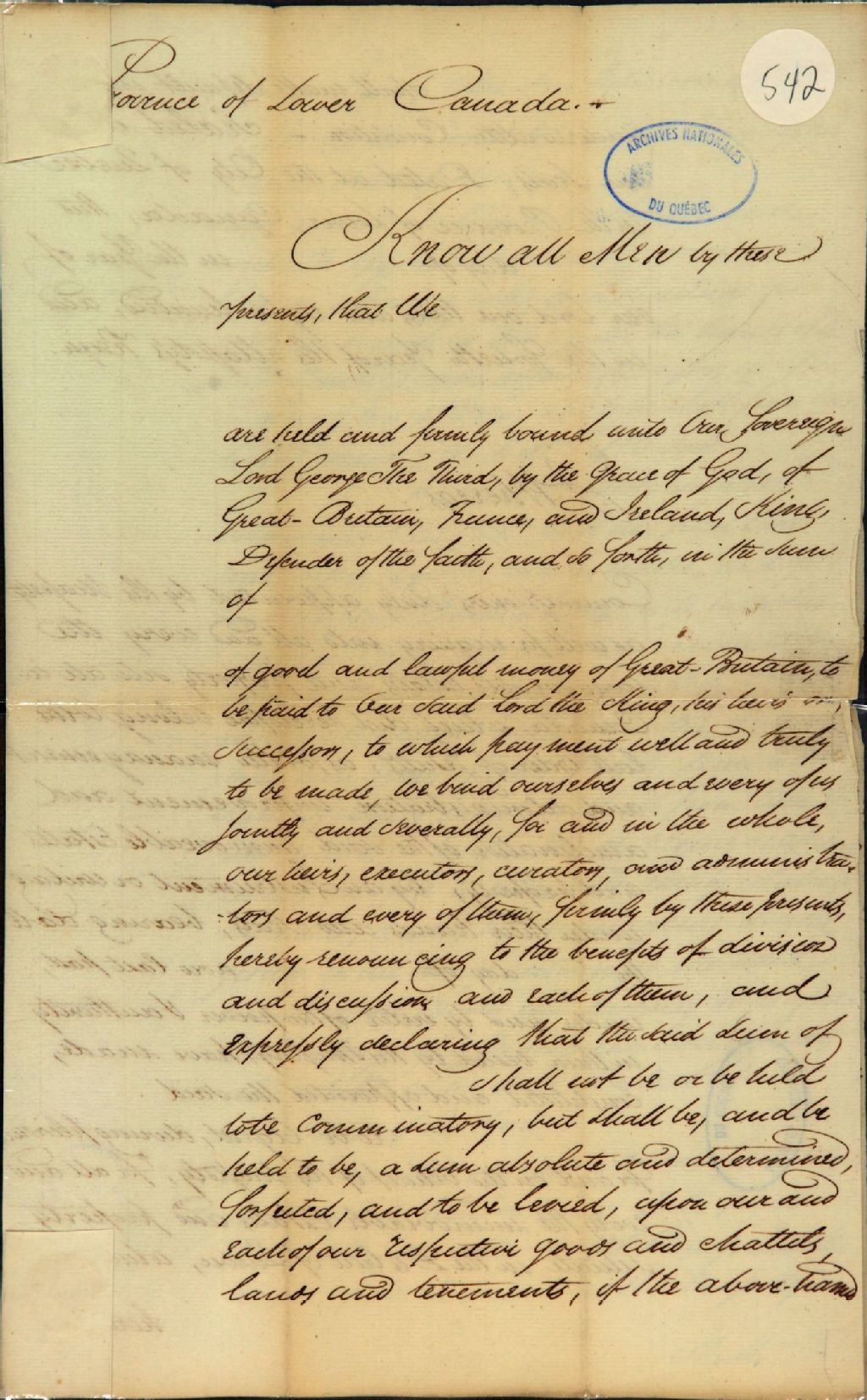 Modèle d'acte de nomination, écrit par Jonathan Sewell, procureur général du Bas-Canada, 25 juillet 1800, Archives nationales à Québec, Fonds Ministère des Terres et Forêts, (03Q,E21,S64,SS5,SSS2,D542).