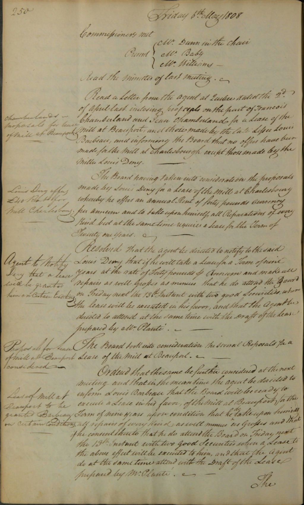 Procès-verbal d'une réunion de la commission responsable de l'administration des biens des Jésuites, au sujet d'offres faites sur les baux des moulins de [la paroisse de] Beauport (seigneurie de Notre-Dame-des-Anges) et de Charlesbourg; où un rapport sur la requête de Christian Becker est préparé; au sujet de la demande de James Dunn, locataire du moulin de Laprairie (Prairie-de-la-Madeleine), réclamant une prolongation de son bail, en vertu des grandes dépenses qu'il a faites pour réparer et améliorer ledit moulin; au sujet de l'impossibilité de l'agent responsable des biens des Jésuites pour le district de Québec (Michel Berthelot) de remettre l'allocation annuelle de blé à [Louis] Vincent, maître d'école à Lorette (Indian-Lorette; Jeune-Lorette), 6 mai 1808, Archives nationales à Québec, Fonds Ministère des Terres et Forêts, (03Q,E21,S64,SS5,SSS2,D690-130).