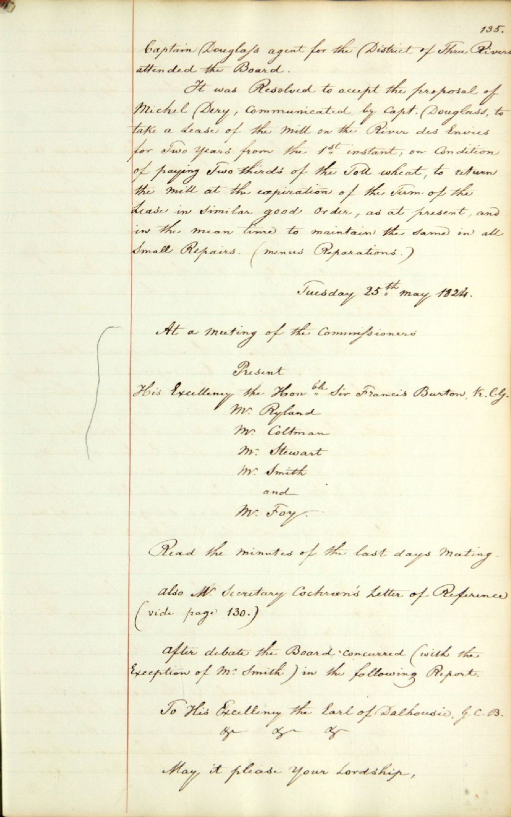 Procès-verbal d'une réunion de la commission responsable de l'administration des biens des Jésuites ; 1) au sujet d'un rapport de la Commission en guide de réponse à une lettre de Andrew William Cochran, secrétaire du gouverneur, en date du 1er mai 1824, sur l'examen effectué par Sir Francis Burton, gouverneur en chef, de l'état actuel du fonds des revenus des biens des Jésuites ; 2) au sujet d'un rapport de Lewis Foy, inspecteur visiteur des biens des Jésuites, sur les améliorations effectuées depuis 1815 sur les biens des Jésuites ; et 3) au sujet d'une demande du Procureur général pour une avance de fonds pour la construction d'une route au domaine de Sillery