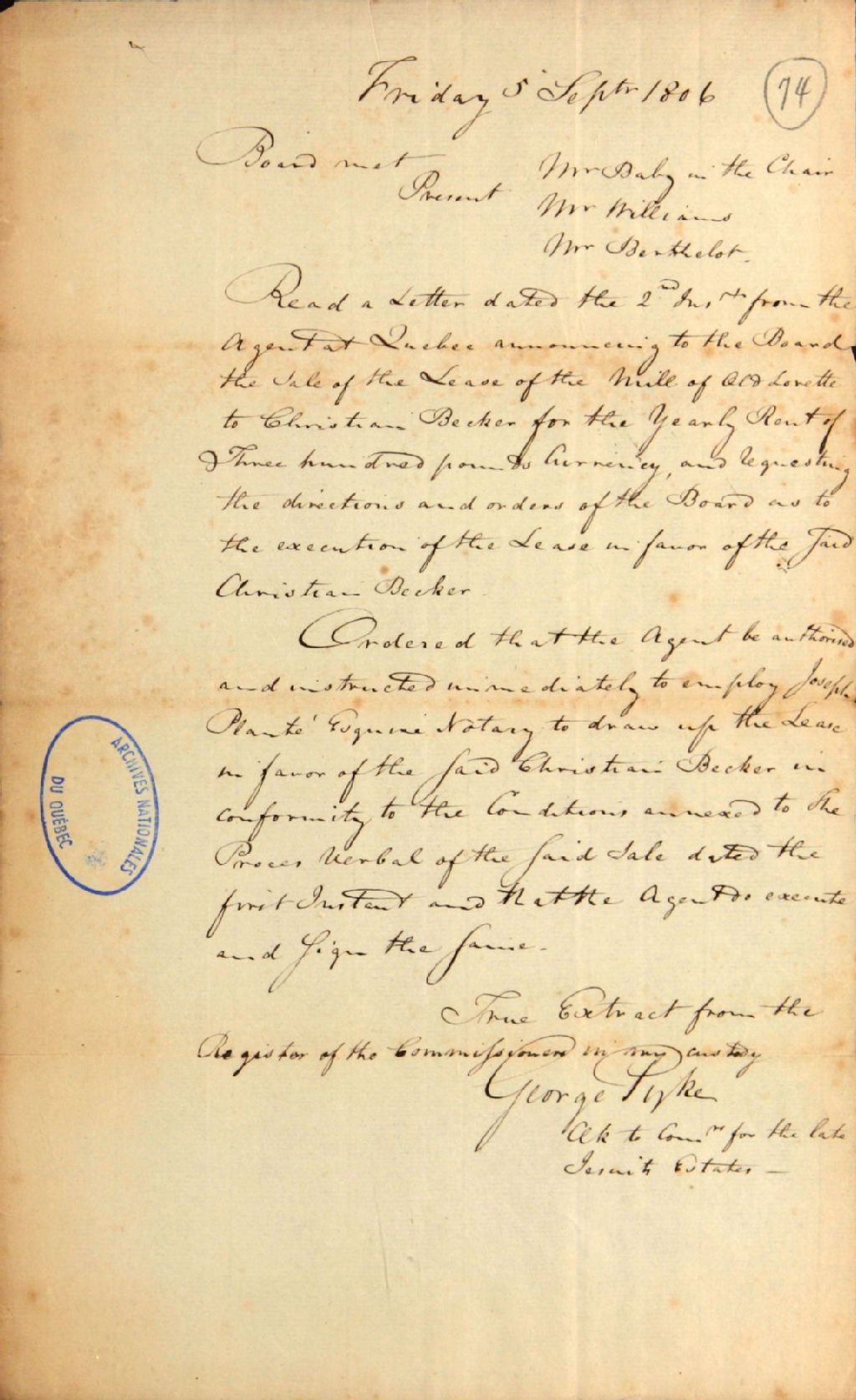 Extrait d'un procès-verbal d'une réunion de la commission responsable de l'administration des biens des Jésuites, au sujet de la vente du bail du moulin de Old Lorette (L'Ancienne-Lorette) à Christian Becker, 5 septembre 1806, Archives nationales à Québec, Fonds Ministère des Terres et Forêts, (03Q,E21,S64,SS5,SSS2,D74).