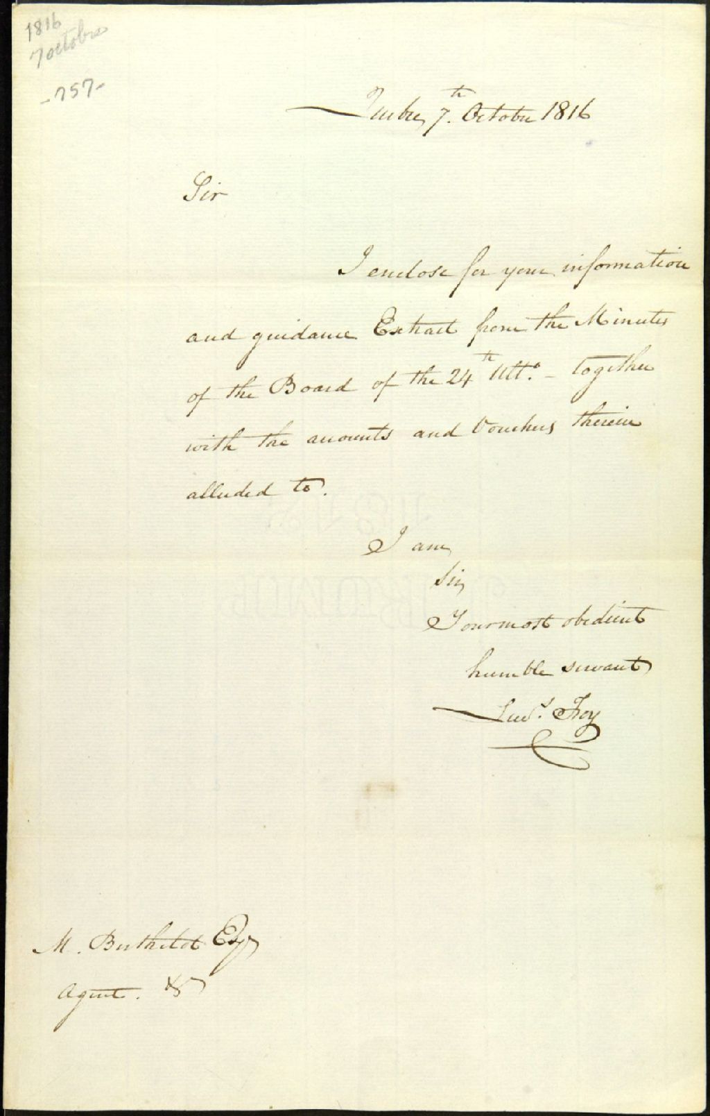 Lettre de Lewis [Louis] Foy [secrétaire des commissaires responsables de l'administration des biens des Jésuites] adressée à Michel Berthelot, agent [des biens des Jésuites pour le District de Québec]; qui indique qu'il lui envoie un extrait des minutes du Conseil ainsi que les comptes et les pièces comptables liés à ce propos (absents)