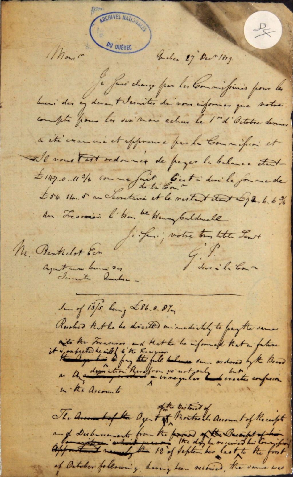 Brouillon de procès-verbaux de réunions de la commission responsable de l'administration des biens des Jésuites, au sujet de la réception d'un coffre marqué d'un sceau rempli de papiers relatifs aux biens des Jésuites et qui était, jusqu'alors, déposé dans le bureau de John Taylor, sous-secrétaire; au sujet des comptes de feu [Maurice-Régis] Blondeau, agent responsable des biens des Jésuites pour le district de Montréal présenté par son curateur, [François-Auguste] Quesnel; au sujet des réparations à réaliser sur un moulin à vent situé dans la seigneurie de la Prairie-de-la-Madeleine; au sujet des comptes des agents de district; au sujet des arrérages dans les seigneuries sous l'administration de ladite commission; au sujet du salaire du secrétaire de ladite commission (George Pyke) (DBC), 19 décembre 1809 - 28 décembre 1809, Archives nationales à Québec, Fonds Ministère des Terres et Forêts, (03Q,E21,S64,SS5,SSS2,D84).