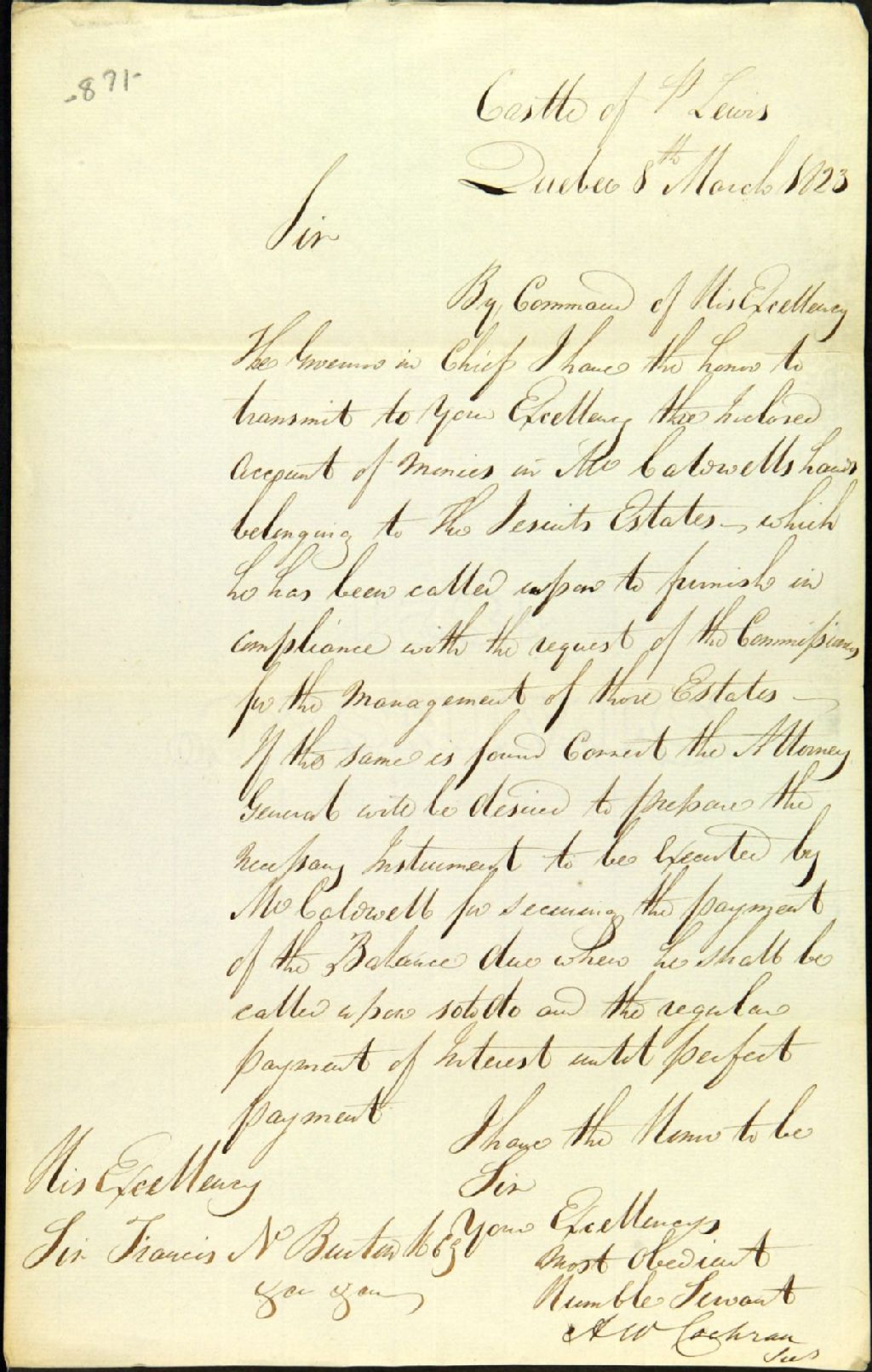 Lettre de A. W [Andrew William] Cochran, secrétaire civil, adressée à Son Excellence sir Francis N. [Nathaniel] Burton pour lui transmettre l'état des revenus de [Henry] Caldwell tirés des terres des biens des Jésuites, 8 mars 1823, Archives nationales à Québec, Fonds Ministère des Terres et Forêts, (03Q,E21,S64,SS5,SSS2,D871).