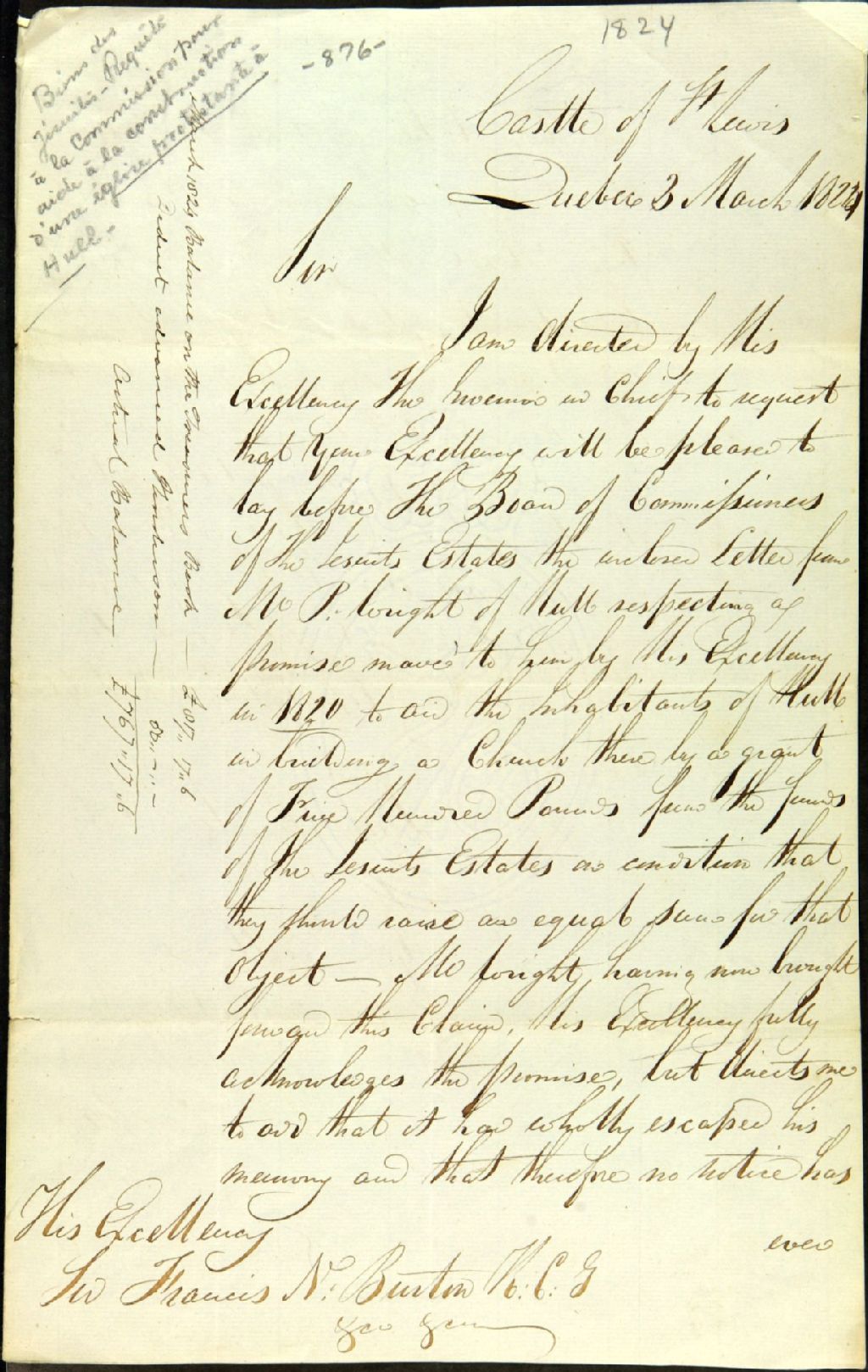 - Requête d'A. W. [Andrew William] Cochran, secrétaire civil, adressée à Son Excellence sir Francis N. [Nathaniel] Burton; en référence à la requête de monsieur Wright qui demande aux commissaires responsables de l'administration des biens des Jésuites une donation, et ce, pour l'érection d'une église dans le canton de Hull