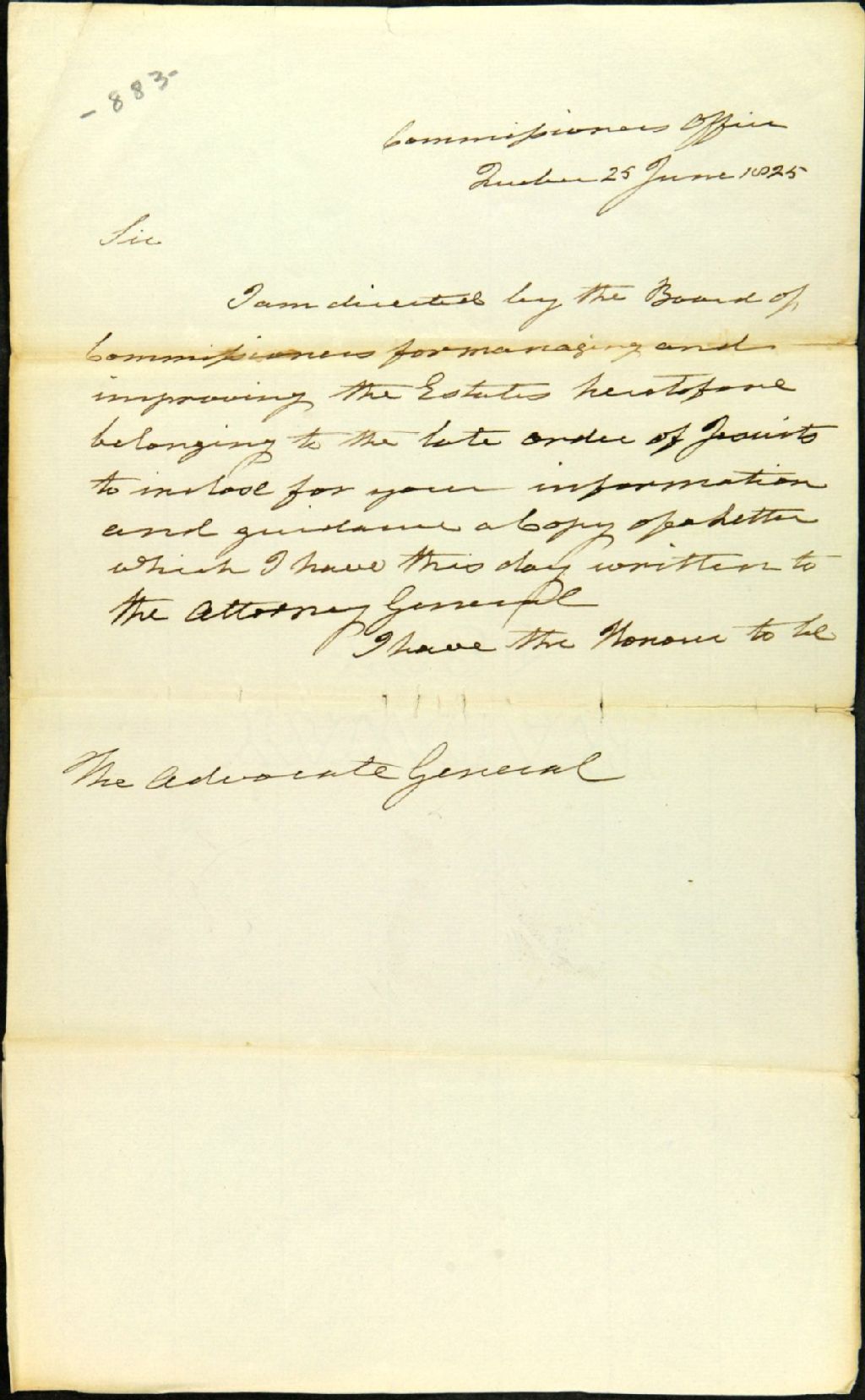 Copie d'une lettre du bureau des commissaires pour l'administration des biens qui appartenaient autrefois aux Jésuites adressée à l'avocat général; au sujet d'instructions et d'une lettre qui a été envoyée au procureur général et qui serait jointe à cet envoi (absente), 25 juin 1825, Archives nationales à Québec, Fonds Ministère des Terres et Forêts, (03Q,E21,S64,SS5,SSS2,D883).