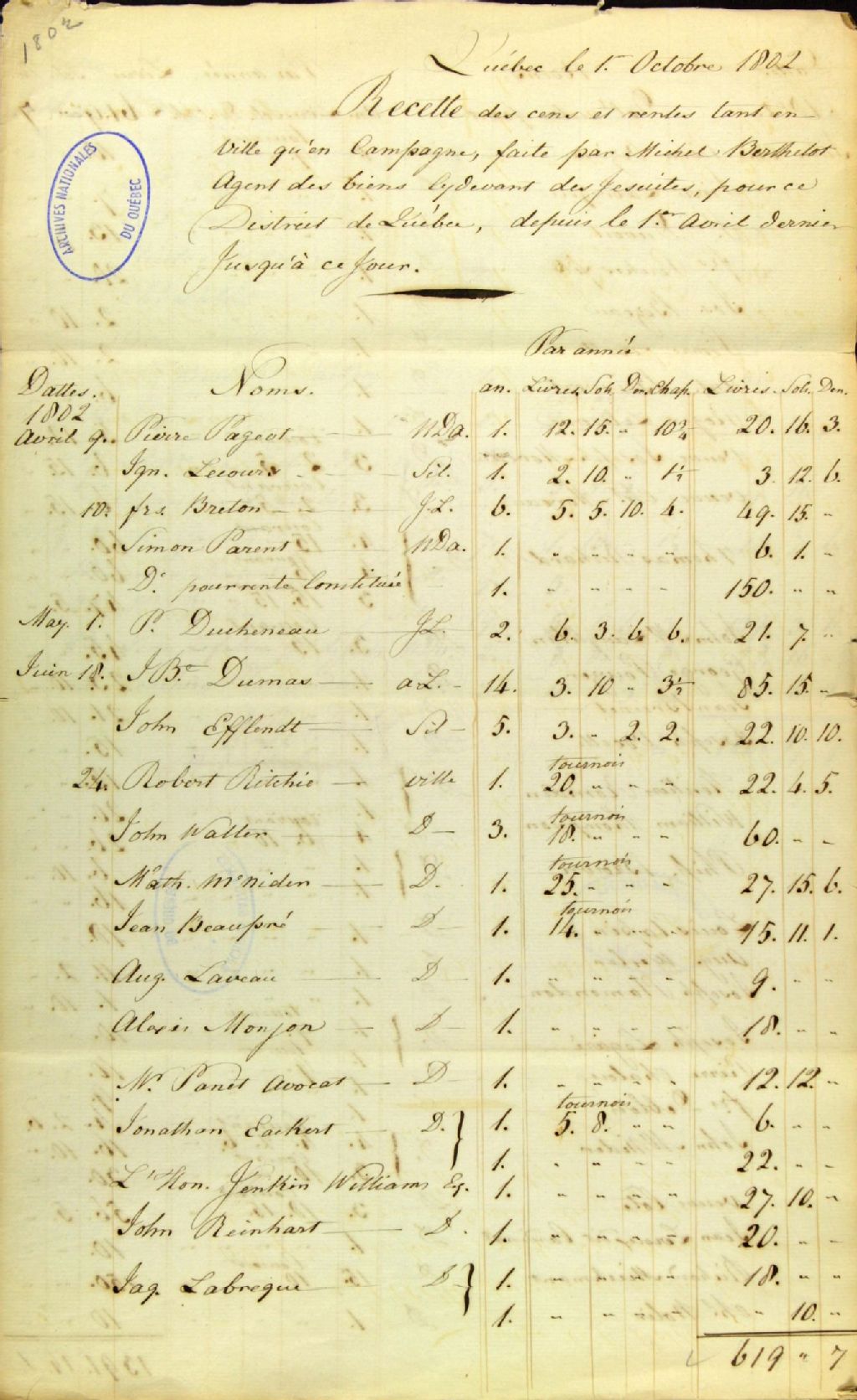 Recettes des cens et rentes et comptes généraux, tant en ville qu'en campagne, que Michel Berthelot, agent des biens des Jésuites, pour le district de Québec, a faites, chapons compris, 1 octobre 1802, Archives nationales à Québec, Fonds Ministère des Terres et Forêts, (03Q,E21,S64,SS5,SSS3,D200).