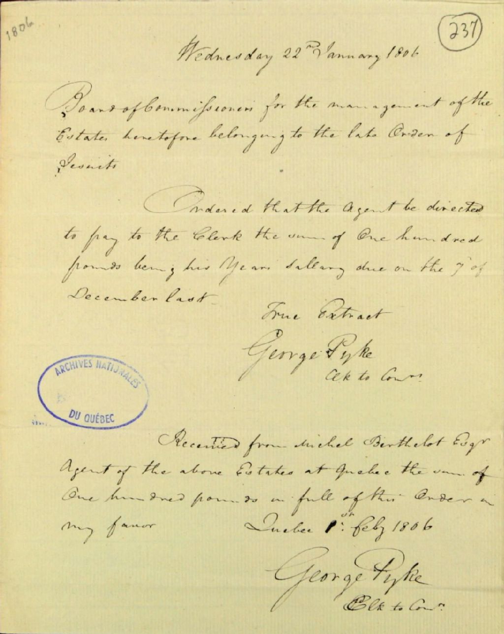 Extrait, concernant le salaire de George Pyke, secrétaire de la commission responsable de l'administration des biens des Jésuites, d'un procès-verbal d'une réunion de ladite commission, 22 janvier 1806 - 1er février 1806, Archives nationales à Québec, Fonds Ministère des Terres et Forêts, (03Q,E21,S64,SS5,SSS3,D237).