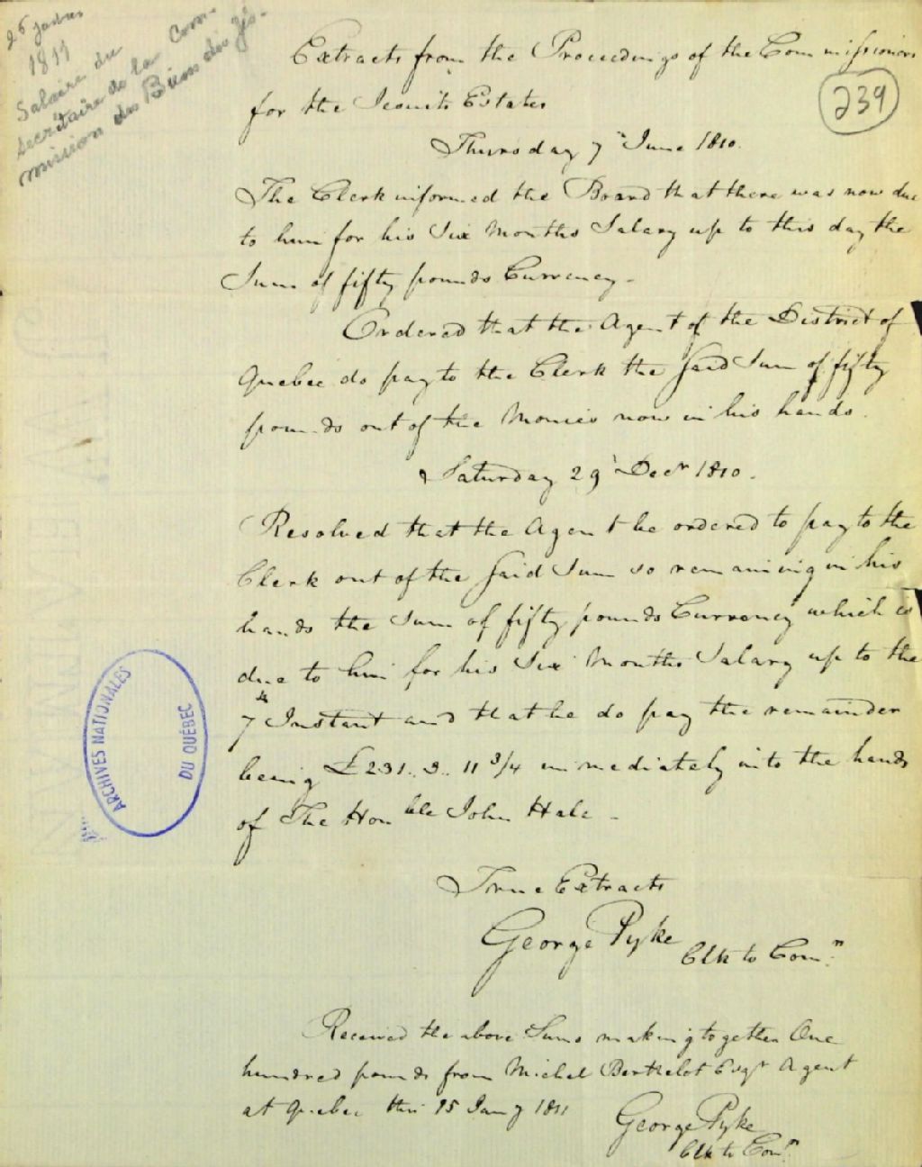 Extrait, concernant le salaire de George Pyke, secrétaire de la commission responsable de l'administration des biens des Jésuites, de procès-verbaux de réunions de ladite commission, 7 juin 1810 - 15 janvier 1811, Archives nationales à Québec, Fonds Ministère des Terres et Forêts, (03Q,E21,S64,SS5,SSS3,D239).