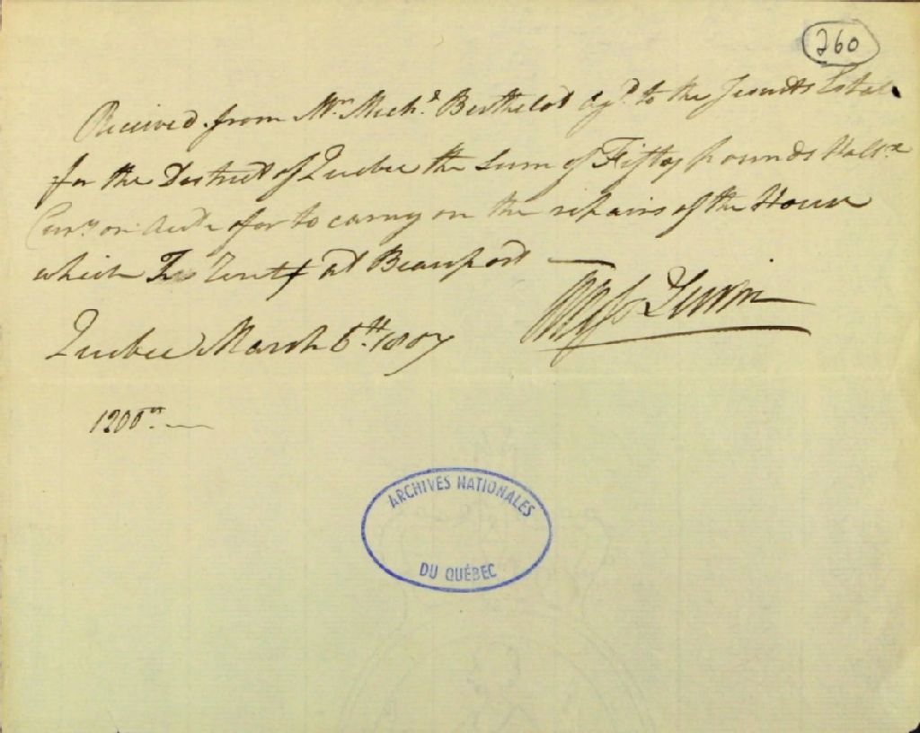 Reçu de Moss Lane, de Québec, à Michel Berthelot, agent des biens des Jésuites pour le district de Québec, pour réparation à une maison louée à Beauport, 6 mars 1807, Archives nationales à Québec, Fonds Ministère des Terres et Forêts, (03Q,E21,S64,SS5,SSS3,D260).