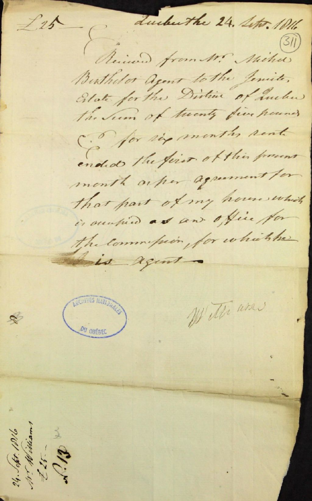 Reçu de J. Williams, de Québec, à Michel Berthelot, agent des biens des Jésuites pour le district de Québec, pour paiement du loyer d'une maison occupée par la commission des biens des Jésuites, 24 septembre 1816, Archives nationales à Québec, Fonds Ministère des Terres et Forêts, (03Q,E21,S64,SS5,SSS3,D311).