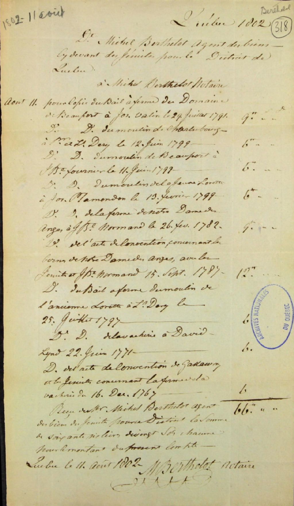 Reçu de Michel Berthelot, notaire, de Québec, à Michel Berthelot, agent des biens des Jésuites pour le district de Québec, pour diverses copies d'actes, 11 août 1802, Archives nationales à Québec, Fonds Ministère des Terres et Forêts, (03Q,E21,S64,SS5,SSS3,D318).