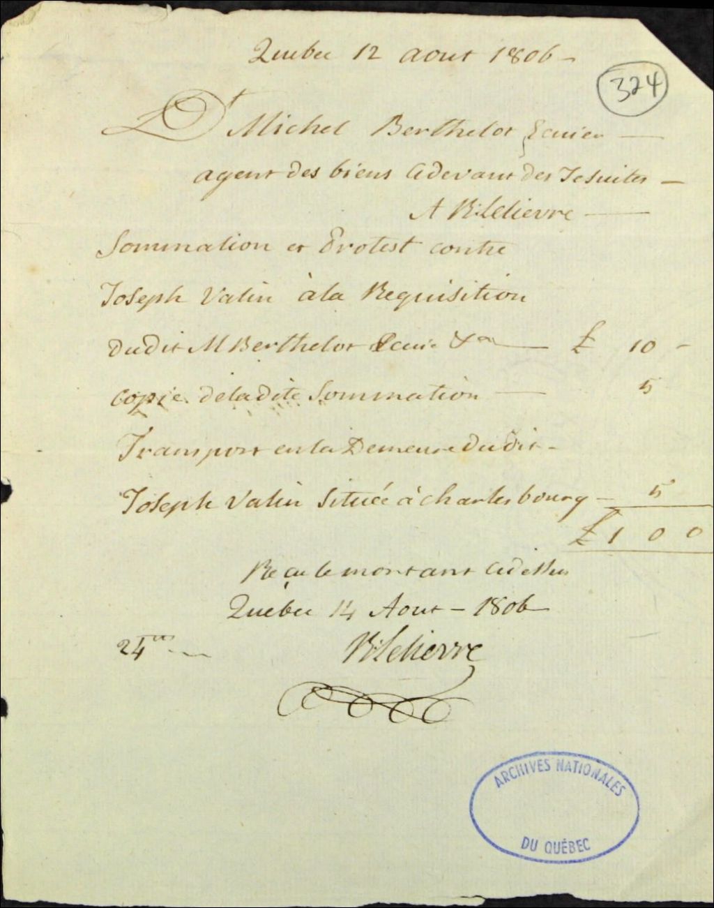 Reçu de Roger Lelièvre, de Québec, à Michel Berthelot, agent des biens des Jésuites pour le district de Québec, pour livraison d'une sommation à Joseph Valin, de Charlesbourg, 14 août 1806, Archives nationales à Québec, Fonds Ministère des Terres et Forêts, (03Q,E21,S64,SS5,SSS3,D324).