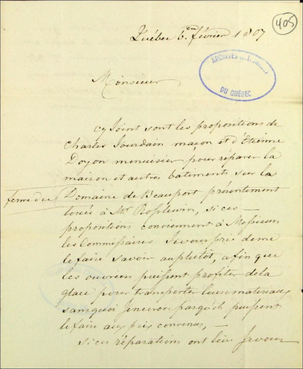 Lettre de Michel Berthelot, agent des biens des Jésuites pour le district de Québec, de la ville de Québec, à George Pyke, secrétaire de la commission des biens des Jésuites, de la ville de Québec, au sujet des propositions de Charles Jourdain, maçon, et de Étienne Doyon, menuisier, pour réparer la maison et autres bâtiments sur la ferme du domaine de Beauport présentement louée à Ross Lewin