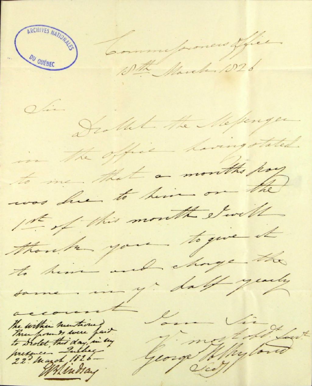 Traite émise par George H. Ryland, secrétaire de la commission des biens des Jésuites, de la ville de Québec, à l'adresse de Robert Christie, agent des biens des Jésuites pour le district de Québec, pour payer un mois de salaire à monsieur Drolet, messager de la commission des biens des Jésuites, 18 mars 1826, Archives nationales à Québec, Fonds Ministère des Terres et Forêts, (03Q,E21,S64,SS5,SSS3,D435).