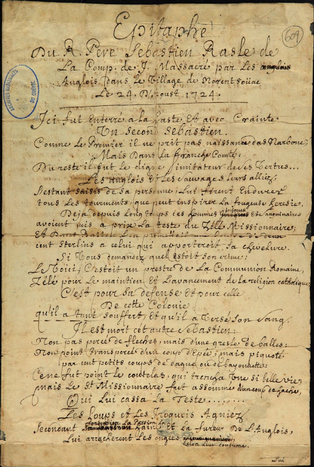 - Épitaphe du Révérend Père Sébastien Rasle, missionnaire de la Compagnie de Jésus, massacré par les Anglais dans le village de Norentsoüac le 24 août 1724