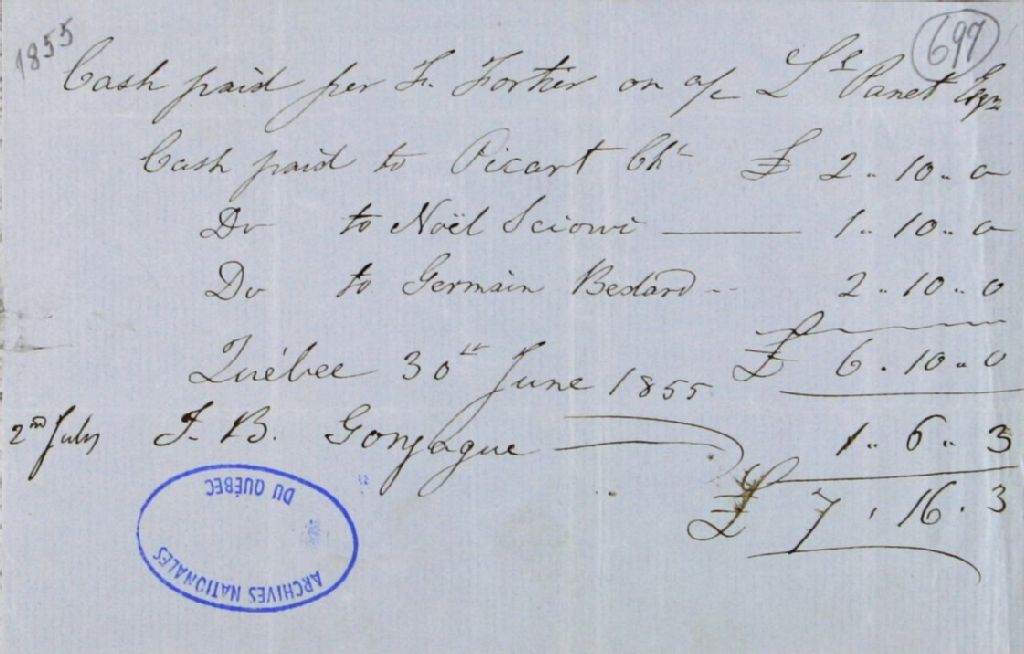 Reçu de Félix Fortier, à Louis Panet, agent des biens des Jésuites pour le district de Québec, pour argent remis à divers particuliers, 2 juillet 1855, Archives nationales à Québec, Fonds Ministère des Terres et Forêts, (03Q,E21,S64,SS5,SSS3,D697).