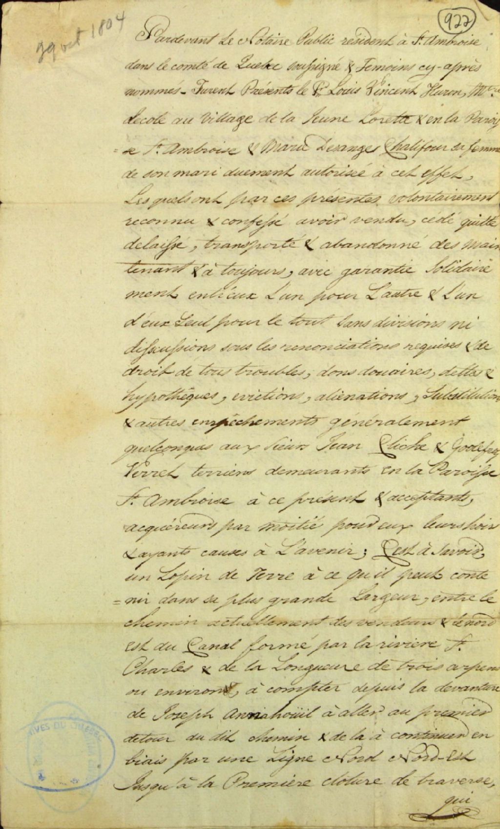 - Collation d'une vente d'un lopin de terre situé près de la rivière Saint-Charles ; par Louis Vincent, huron maître d'école, et Marie-des-Anges Chalifour, son épouse, du village de la Jeune-Lorette, à Jean Cliche et Godefroy Verret, terriens, de la paroisse Saint-Ambroise