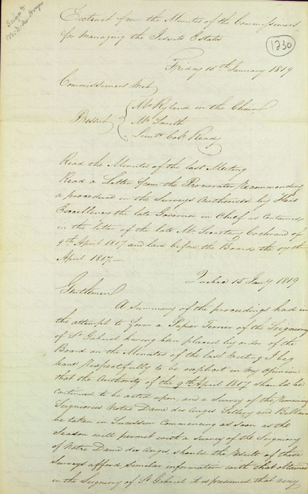 Extraits de procès-verbaux de la commission responsable de l'administration des biens des Jésuites concernant les délibérations relatives à la confection d'un papier terrier de la seigneurie Saint-Gabriel et à l'arpentage des seigneuries de Bélair (Bellair), Notre-Dame-des-Anges et Sillery, vers 1820, Archives nationales à Québec, Fonds Ministère des Terres et Forêts, (03Q,E21,S64,SS5,SSS5,D1230).