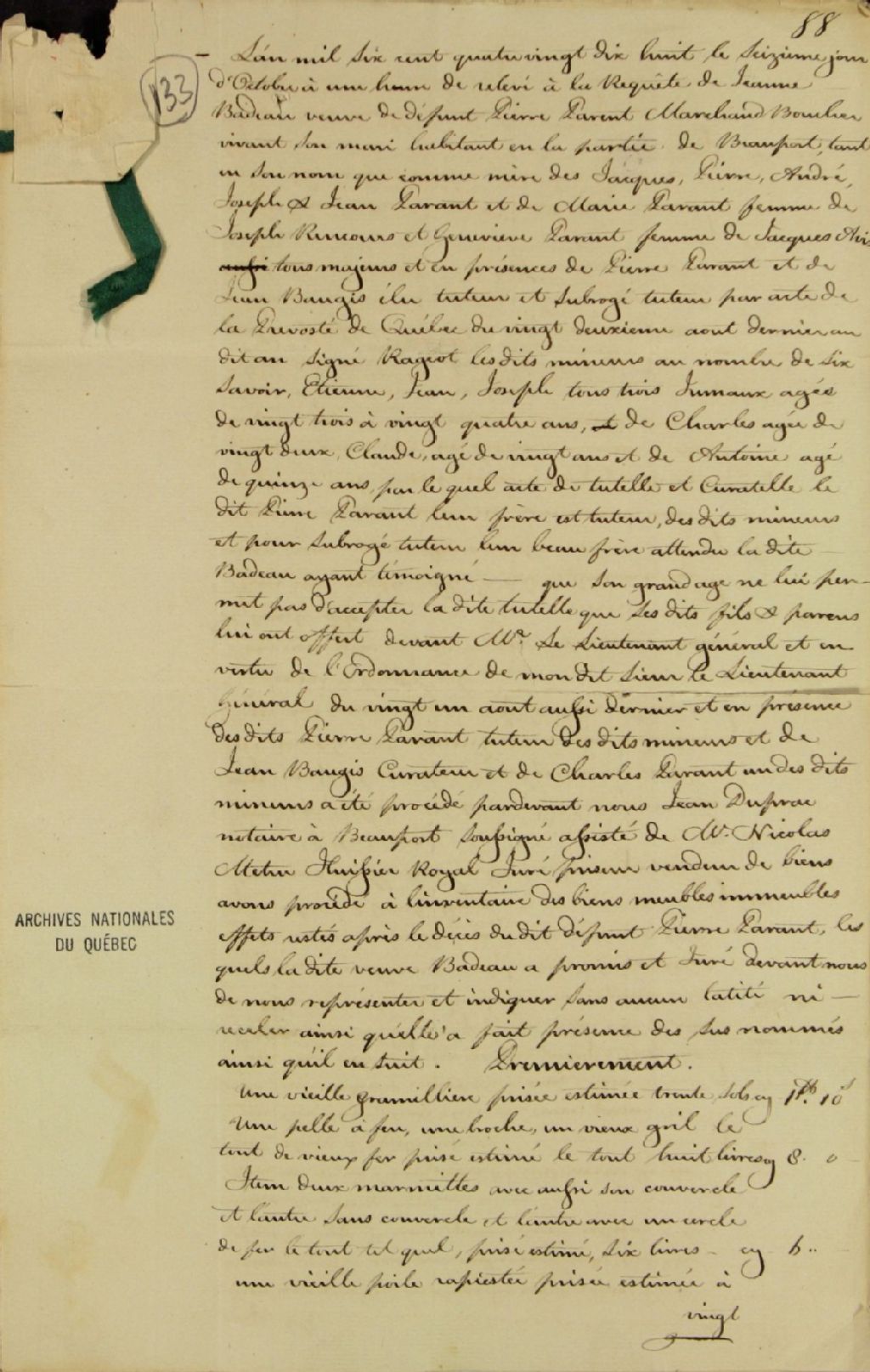 Inventaire des biens meubles et immeubles du défunt Pierre Parent, marchand boucher, de son vivant habitant à Beauport, et de Jeanne Badeau, sa veuve, à la requête de ladite veuve, faisant tant en son nom que comme mère de Jacques, Pierre, André, Joseph et Jean Parent, de Marie Parent, femme de Joseph Rancourt, et de Geneviève Parent, femme de Jacques Avice, et en présence de Pierre Parent et de Jean Baugis, élus tuteur et subrogé tuteur aux six enfants mineurs du couple, à savoir Étienne, Jean et Joseph Parent, tous trois jumeaux (triplés), Charles, Claude et Antoine Parent