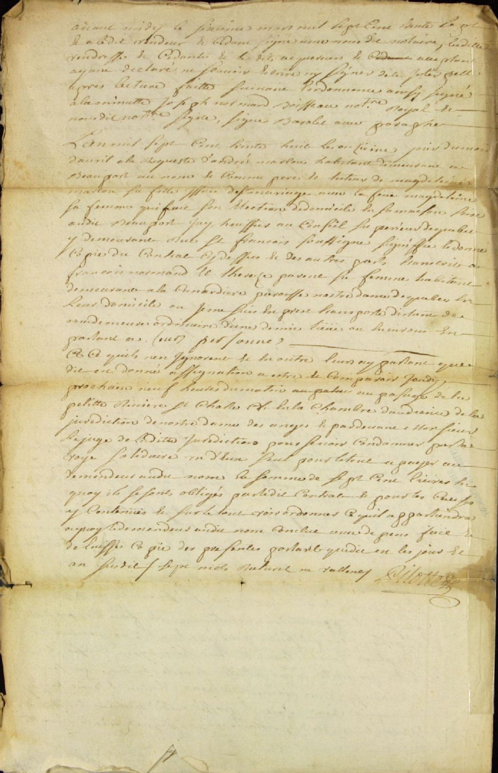 Déclaration du huissier Pilote à l'effet qu'il a baillé copie d'un contrat de vente à François Normand et à Thérèse Parent, sa femme, habitants demeurant à la Canardière en la paroisse de Notre-Dame-de-Québec, et leur a remis une assignation à comparaître le jeudi suivant à neuf heures du matin au passage de la Petite Rivière Saint-Charles, en la chambre d'audience de la Juridiction de Notre-Dame-des-Anges, à la requête d'André Marcoux, habitant demeurant à Beauport, faisant au nom et comme père et tuteur de Madeleine Marcoux, issue de son mariage avec la défunte Madeleine Normand