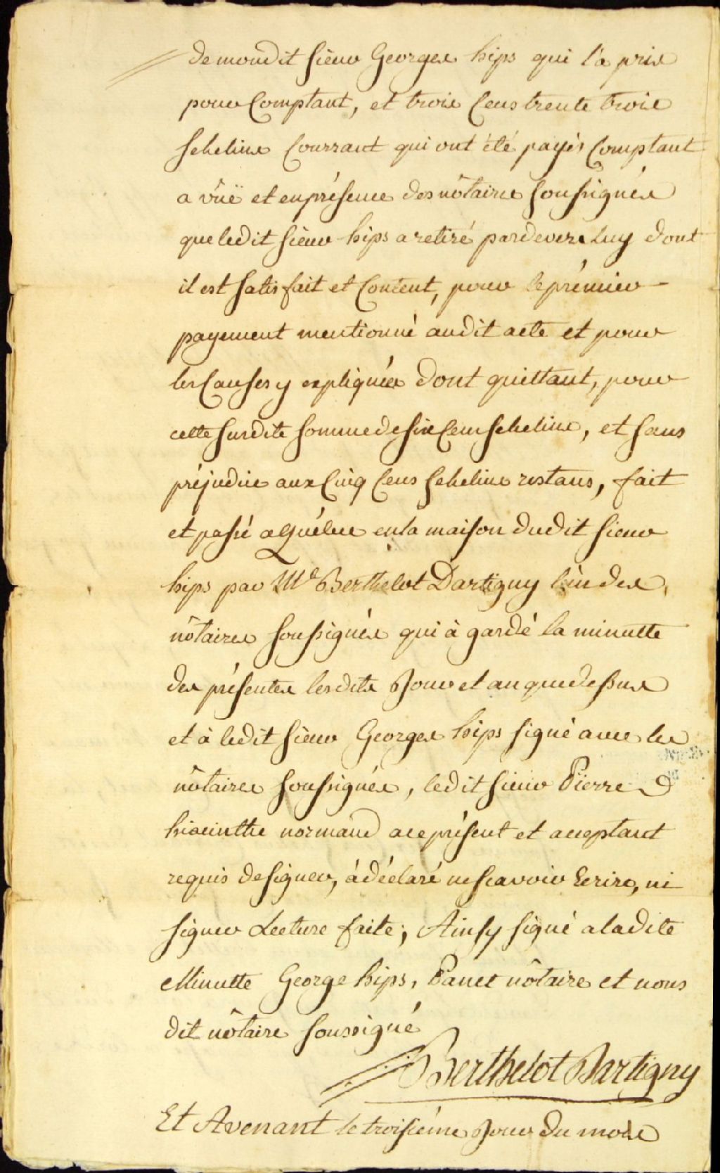 Quittance générale du sieur George Hiss (Hips, Istre?) en faveur du sieur Pierre Hyacinthe Normand, comparant par dame Marie-Josèphe Gauvreau, son épouse, ledit sieur Normand ayant versé audit sieur Hiss la somme de cinq cents shillings courants de la province de Québec restante de celle de onze cents shillings courants portée par le contrat de partage, convention et vente passé entre eux, 3 juillet 1775, Archives nationales à Québec, Fonds Ministère des Terres et Forêts, (03Q,E21,S64,SS5,SSS5,D302-3).